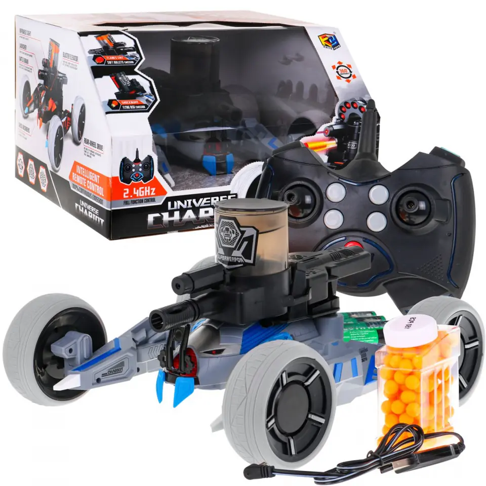 Pojazd bojowy, robot strzelający kulkami to zabawka dla dzieci od 5-go roku życia. Model nie tylko jeździ we wszystkich kierunkach ale również strzela kulkami do przeciwników. Można zorganizować prawdziwą walkę. Na przodzie robota znajduje się czujnik uderzeń, po trzecim trafieniu robot gaśnie, zostaje „zabity", należy wówczas ponownie go uruchomić. Pojazd wyposażony jest w celownik laserowy ułatwiający namierzenie celu i magazynek na aż 50 kulek. Duże gumowe koła pojazdu pokonają wszelkie przeszkody, świetnie sprawdzi się podczas zabawy na świeżym powietrzu. Amortyzatory zapewniające płynną jazdę, manewrowanie i pokonywanie zakrętów. Zabawka zasilana jest bateriami typu 6V-autko (w zestawie), AG10 x 3- laser (w zestawie), 4 x AA 1,5V - pilot (w zestawie).