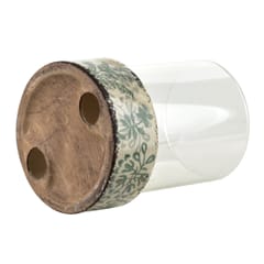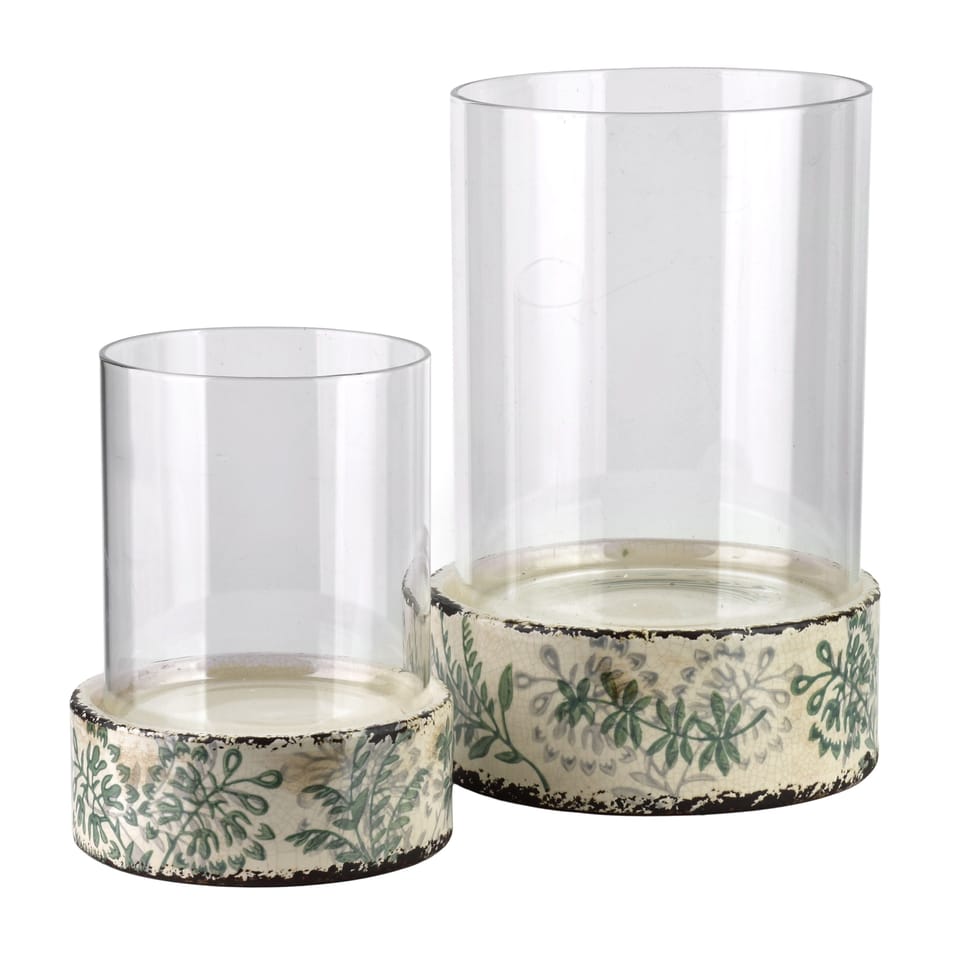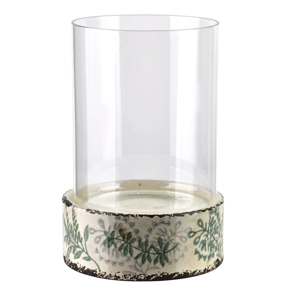 Okazały świecznik z linii CROCKET to stylowa dekoracja, która łączy naturalne materiały z eleganckim wzornictwem. Produkt składa się z wysokiego, przezroczystego klosza wykonanego ze szkła oraz dekoracyjnej bazy z ceramiki. Podstawa przyciąga wzrok subtelnym, malarskim motywem roślinnym w kolorze stonowanej zieleni, który pięknie kontrastuje z jasnym, kremowym tłem ceramiki. Szklany cylinder o prostej formie skutecznie osłania płomień świecy przed przeciągami, jednocześnie pozwalając na swobodne rozchodzenie się ciepłego blasku w całym pomieszczeniu. Dzięki swoim pokaźnym wymiarom wynoszącym 18 x 18 x 21 cm, świecznik ten stanowi wyrazisty akcent dekoracyjny, który doskonale odnajdzie się na środku stołu jadalnianego, na szerokiej komodzie lub jako element aranżacji tarasowej w letnie wieczory. Wyjątkowa estetyka kolekcji CROCKET sprawia, że produkt ten idealnie wpisuje się we wnętrza urządzone w stylu klasycznym, rustykalnym oraz eko.Specyfikacja produktu: Świecznik posiada wymiary 18 x 18 x 21 cm i został wykonany z wysokiej jakości szkła oraz zdobionej ceramiki. Produkt należy do eleganckiej serii akcesoriów domowych CROCKET.wymiary: 18x18x21cm