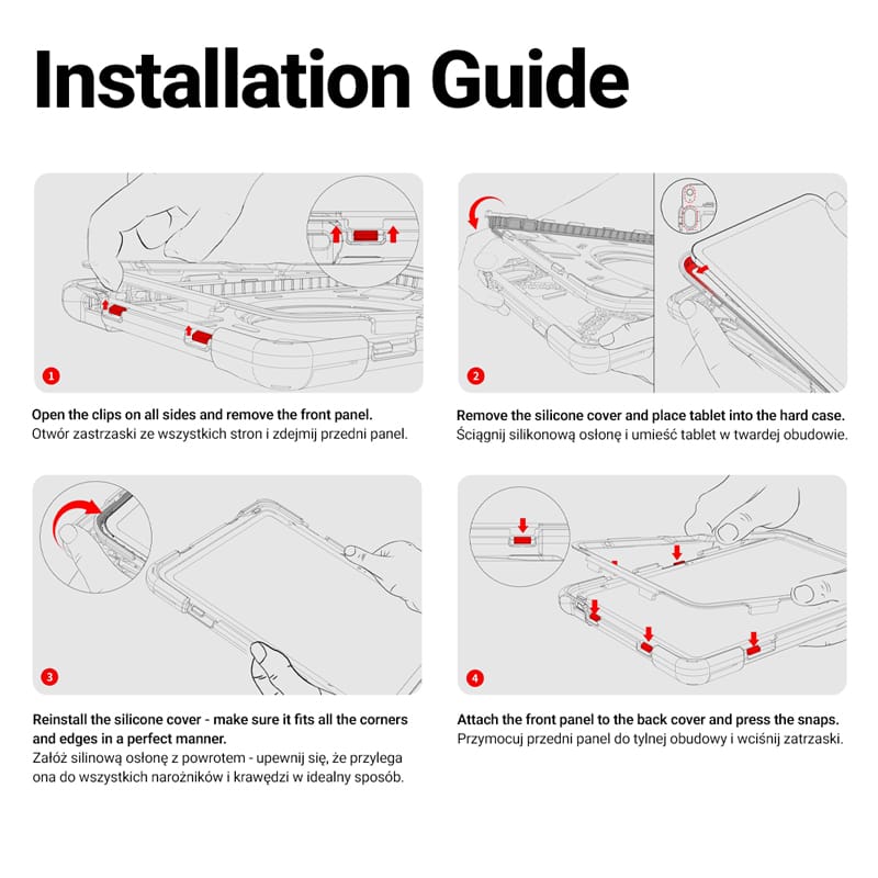 - Przygotuj bazę: zdejmij silikonową osłonę, a następnie umieść tablet wewnątrz twardej części obudowy.