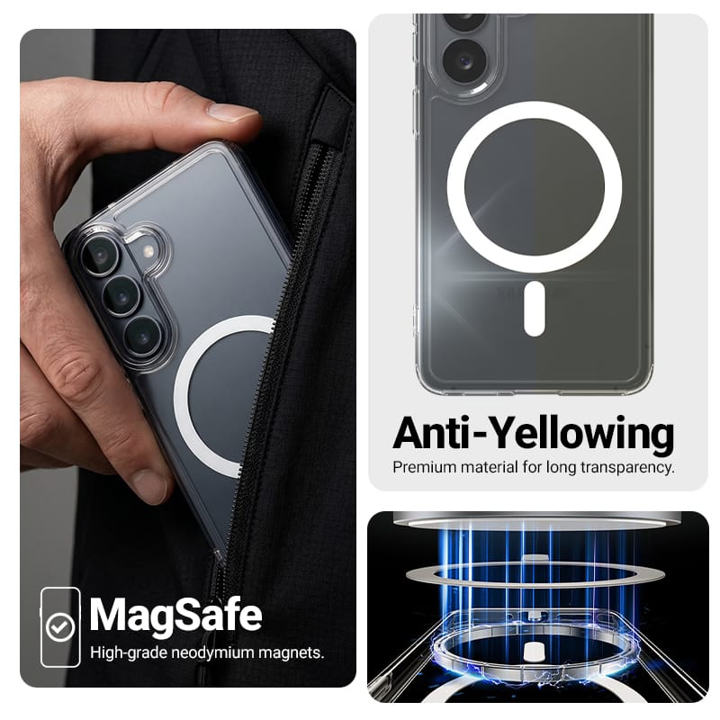 Etui wykorzystuje hybrydową konstrukcję Anti-Shock, zapewniającą podwyższony poziom ochrony i skutecznie amortyzującą wstrząsy. Dzięki wbudowanemu pierścieniowi magnetycznemu MagSafe i wysokiej jakości magnesom neodymowym N52, telefon stabilnie łączy się z ładowarkami bezprzewodowymi, power bankami, uchwytami samochodowymi i magnetycznymi portfelami.