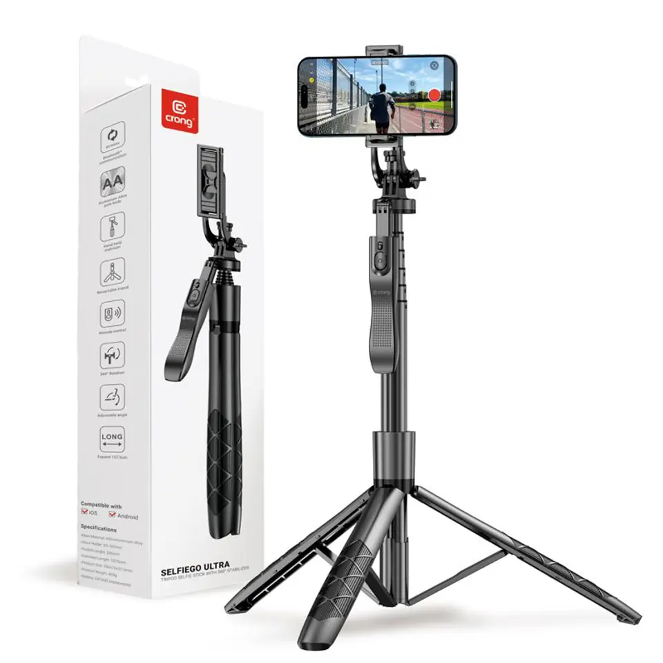 Crong SelfieGo Ultra – Aluminiowy selfie stick Bluetooth tripod czarny