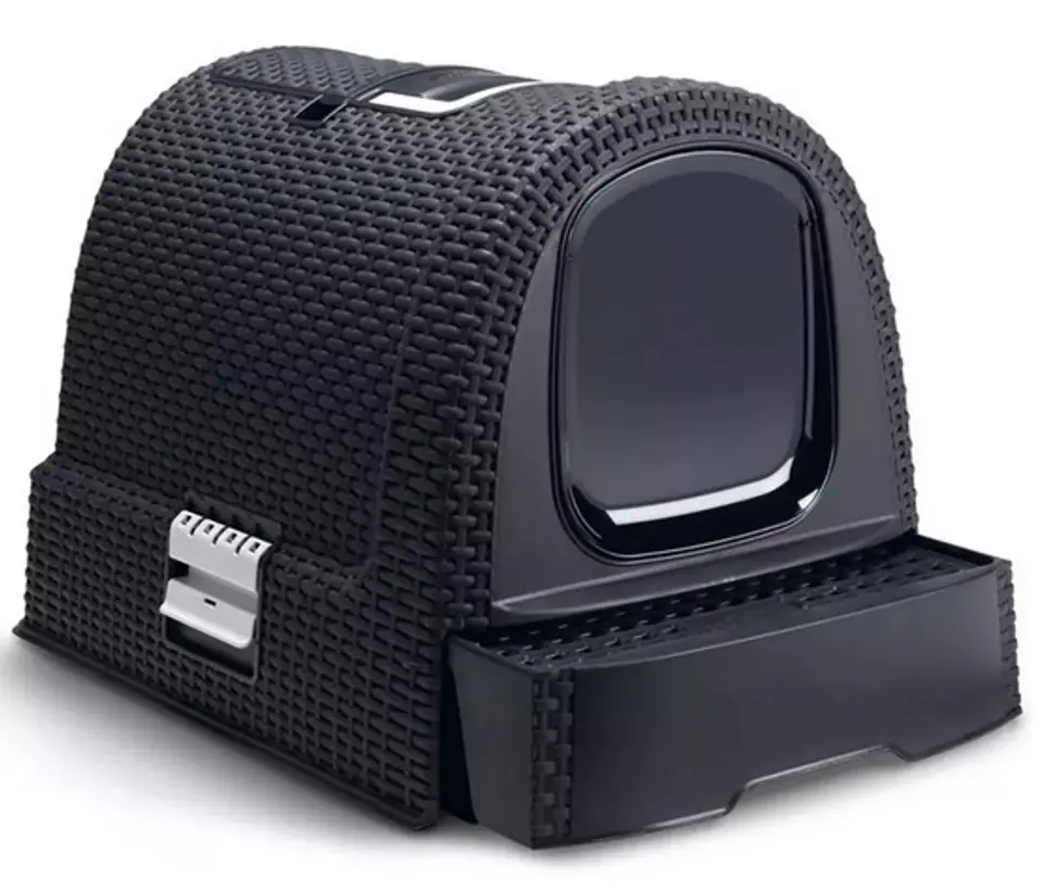 Estetyczna, przypominająca rattanowy kosz kuweta dla kota z wysuwaną szufladą i schowkiem na akcesoria (łopatka i mata czyszcząca łapki w zestawie), niezwykle łatwa w montażu i czyszczeniu. Kuweta posiada szczelne zatrzaski ograniczające wysypywanie się żwirku i filtr przeciwzapachowy, dla zwiększonego komfortu użytkowania. Jej obudowa, wyposażona w uchwyt, jest łatwa do przenoszenia.