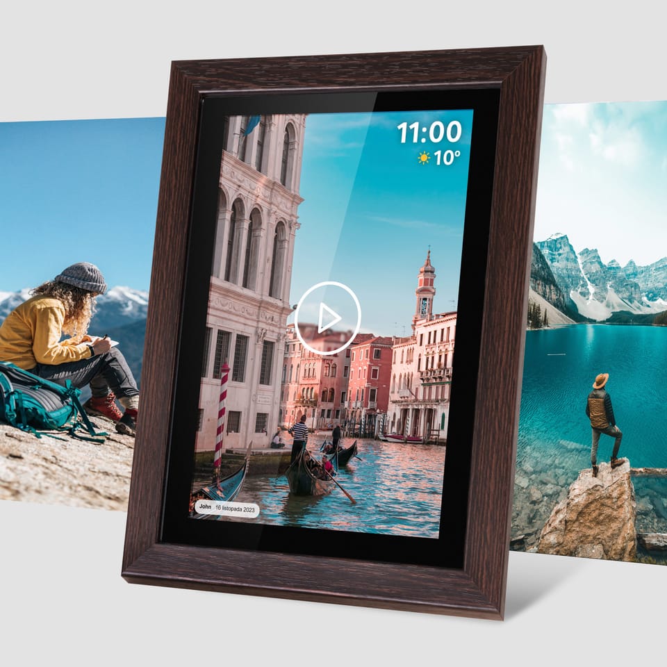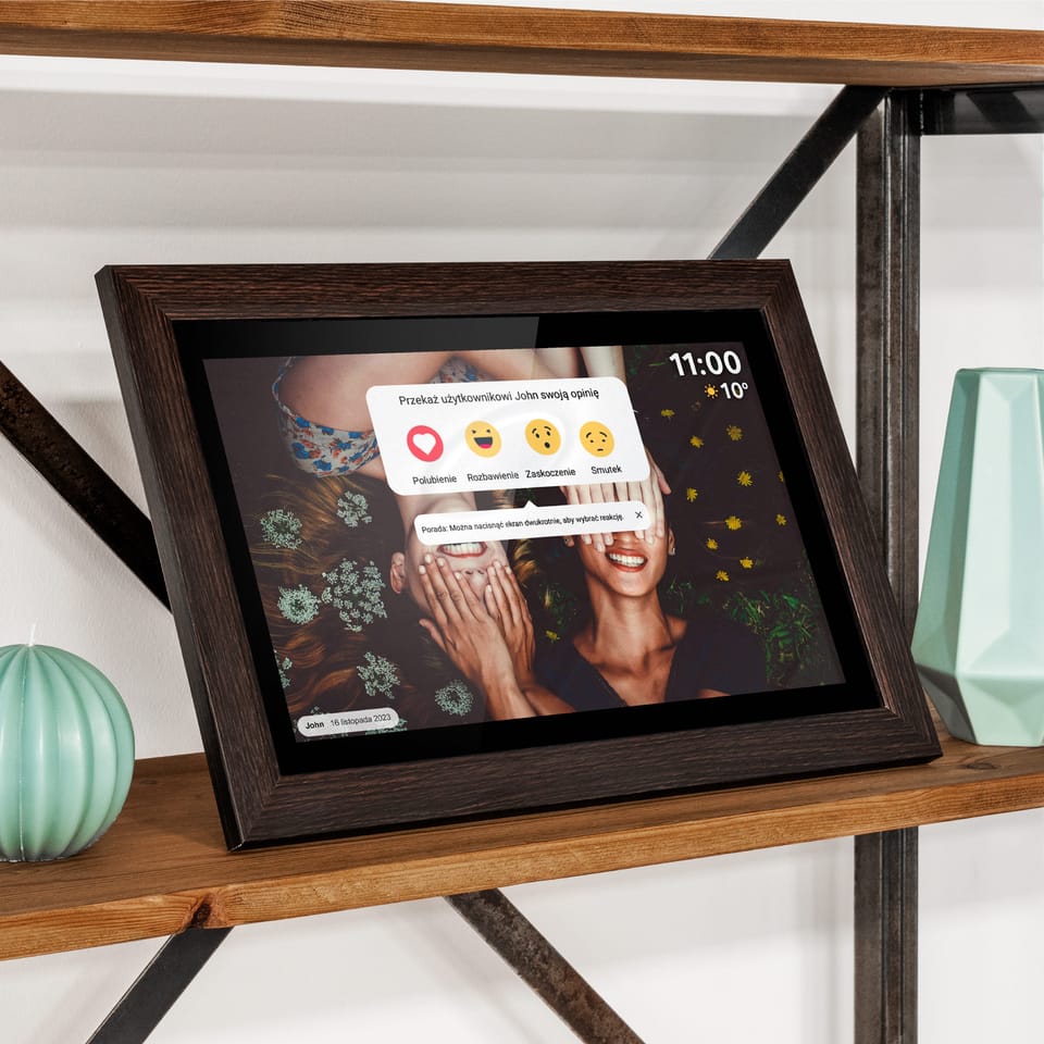 Przesyłanie zdjęć ze smartfona przez aplikację FrameoMożliwość montażu na ścianie lub podpórceOdtwarzanie klipów wideo MP4, 3GPFunkcja timera i automatycznego usypianiaDodawanie opisów i reakcji do zdjęćLosowe wyświetlanie zdjęćWyświetlanie zdjęć z karty pamięci microSDWyświetlanie pogodyObsługiwany format zdjęć: JPEG, JPG, PNG, WEBP, HEICObsługiwany format filmów: MP4, 3GP------------------------WYŚWIETLACZ------------------------Rozmiar: 15,6'' / IPSRozdzielczość: 1920 x 1080 pxProporcje: 16:9Panel dotykowy: 5 punktowy------------------------SYSTEM I PARAMETRY------------------------System operacyjny: Android 6.1Procesor: Rockchip RK3128 Quad corePamięć RAM: 1 GBPamięć wewnętrzna: 16 GBMaks. pojemność karty pamięci: 32 GBGniazdo USB-CGłośnik monoWi-Fi: 802.11 b/g/n (2,4 GHz)Zasilanie: DC 5 V / 2 A------------------------CECHY FIZYCZNE------------------------Zasilacz: 100 - 240 V AC ; 50/60 HzWymiary: 435 x 284 x 28 mmWaga: 1653 gW zestawie: podstawka, zasilacz, instrukcja obsługi