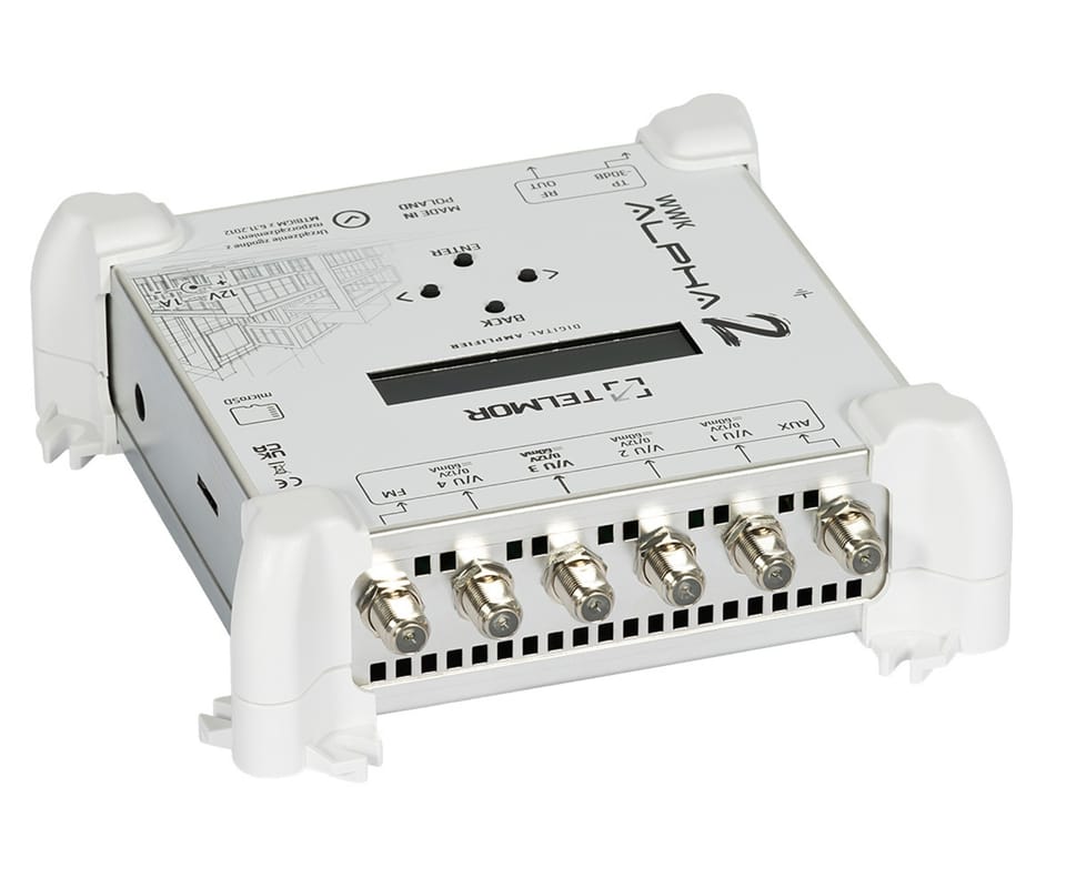 WWK-ALPHA-2 to zaawansowany, cyfrowy wzmacniacz wielozakresowy przeznaczony do profesjonalnych instalacji antenowych SMATV oraz rozbudowanych instalacji indywidualnych. Umożliwia selektywną obróbkę sygnałów DVB-T/T2 w pasmach VHF i UHF, integrację sygnałów DAB oraz FM, a także współpracę z zewnętrznymi modulatorami i stacjami czołowymi poprzez wejście AUX. Platforma DSP zapewnia precyzyjną regulację poziomu każdego multipleksu, przemianę kanałową w obrębie pasma, automatyczną regulację wzmocnienia (AGC) oraz wysoką odporność na zniekształcenia intermodulacyjne, a zaawansowane filtrowanie LTE 700 / LTE 800 (w tym filtr SAW dla pasma 700) ogranicza wpływ zakłóceń LTE/5G.