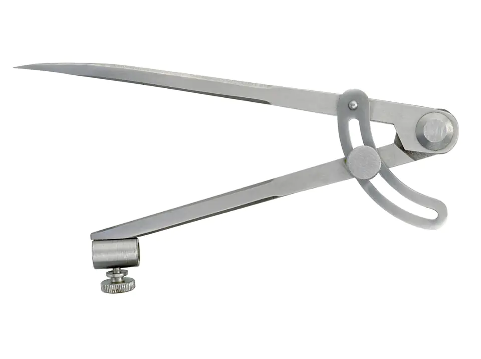 Cyrkiel. Ze stali. Ramiona o przekroju prostokątnym. Z zewnętrzną prowadnicą łukową i oprawką do ołówka. Dostarczany bez ołówka.