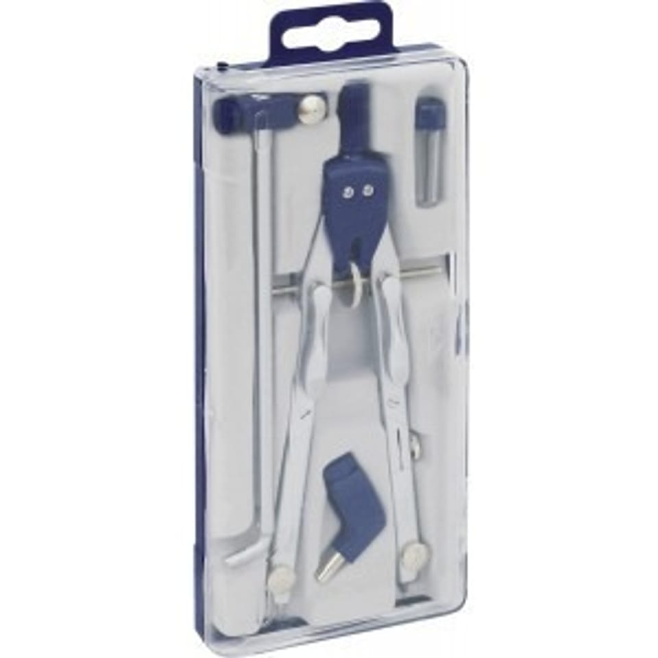 * 4 elementy w zestawie: cyrkiel mikrometryczny 172 mm z mechanizmem śrubowym (oba ramiona łamane), końcówka cyrkla z uchwytem uniwersalnym, zapasowy grafit, przedłużacz