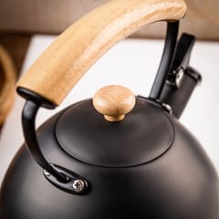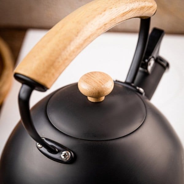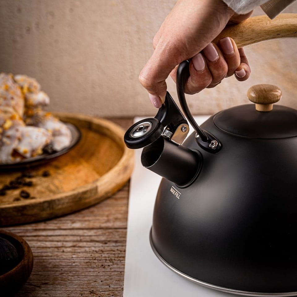 Czajnik wyposażono w głośny gwizdek, wygodną dźwignię przy wylewce oraz ergonomiczny uchwyt wykonany z naturalnego drewna, który pozostaje komfortowy w dotyku. Dzięki kompatybilności ze wszystkimi rodzajami kuchenek masz pełną swobodę użytkowania.