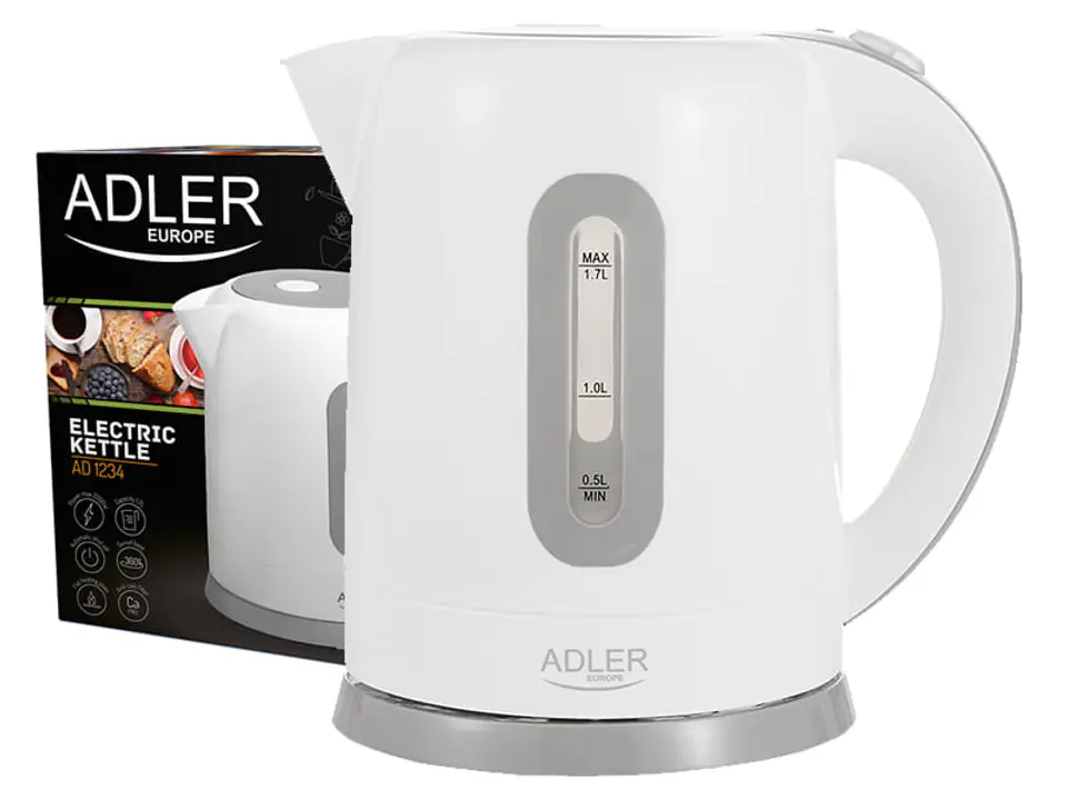 Wewnątrz kolorowego opakowania znajduje się; dobrze zabezpieczony do transportu czajnik Adler AD 1234, podstawka oraz instrukcja obsługi w 22 językach krajów, gdzie jest on sprzedawany.