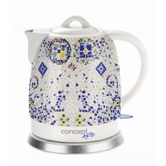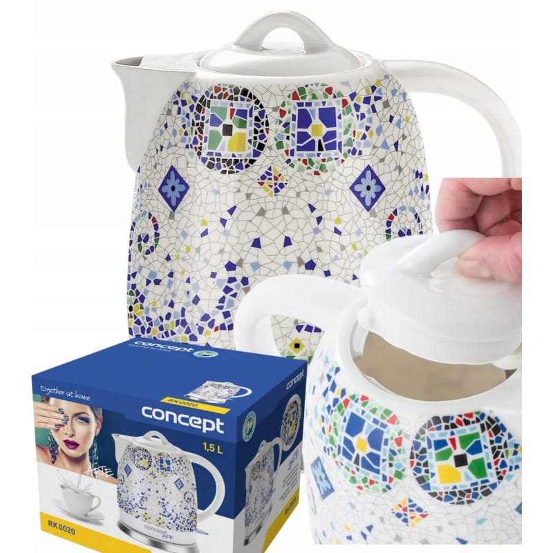 NAJWYŻSZAJ JAKOŚCICZAJNIK ELEKTRYCZNYRENOMOWANEJ FIRMY CONCEPTMODEL: RK-0020Czajnik ceramiczny RK0020 Arte o pojemności 1,5 litra stanie się nie tylko przydatnym pomocnikiem, ale także oryginalną ozdobą Twojej kuchni. Dzięki unikalnemu designowi przywołuje przyjemną atmosferę Orientu. Może być również używany jako klasyczny imbryk do serwowania ulubionej herbaty bezpośrednio na stole.Jakość wykonaniaCzajnik wykonany jest z wysokiej jakości, bardzo trwałej i zdrowej ceramiki, która wyróżnia się łatwą i szybką powierzchnią czyszczenia. Gotowana woda jest bezwonna, ponadto materiał ceramiczny utrzymuje ciepło wody przez długi czas.Łatwa obsługaCzajnik wyposażony jest w zdejmowaną pokrywkę ceramiczną, co ułatwa nalewanie wody. Ukryta grzałka zapobiega osadzaniu się brudu i kamienia. Dzięki podziałce wody wewnątrz czajnika możesz kontrolować ilość wody. Czajnik jest wyposażony w pełni obrotową podstawę, na której można postawić urządzenie pod dowolnym kątem. W podstawce znajdziesz praktyczne miejsce do przechowywania nadmiaru przewodu.Bezpieczeństwo na pierwszym miejscuCzajnik jest wyposażony w podwójny system bezpieczeństwa, tj. wyłącza się automatycznie, gdy osiągnie temperaturę wrzenia lub gdy włączysz urządzenie bez wody. Jednocześnie wyłącznik służy jako wskaźnik pracy, który zapala się przy każdym włączeniu czajnika.Parametry techniczne:Objętość: 1,5 lWysokiej jakości, bardzo trwała i zdrowa ceramikaWskaźnik podziału wody wewnątrz czajnikaUkryta grzałkaPodwójny system bezpieczeństwaŁatwe czyszczenieKontrolka pracyKolor: biały + nadrukMoc: 1150 - 1350 WNapięcie: 220 – 240 VWaga: 1,92 kgslimtex