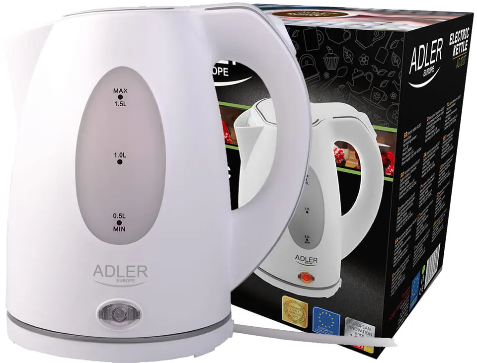 Czajnik Adler AD 1207 posiada solidny, pewny i wygodny uchwyt. Rączka jest zaokrąglona w środku a płaska na zewnątrz. Na górnej części rączki znajduje się włącznik i wyłącznik w jednym przycisku. Okrągła podstawka to duża stabilność i miejsce na zwinięcie przewodu zasilającego. Dwa duże wodowskazy znajdują się na bokach czajnika, mają one wyraźnie zaznaczoną skalę od 0,5 litra do 1, 5 L. Obok wodowskazu, w dolnej części obudowy czajnika podczas jego pracy świeci się pomarańczowa lampka kontrolna. Wewnątrz obudowy zainstalowana jest duża okrągła stalowa grzałka o mocy 2000 W.