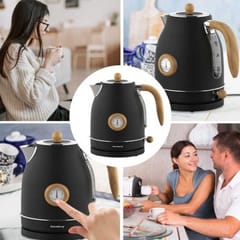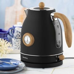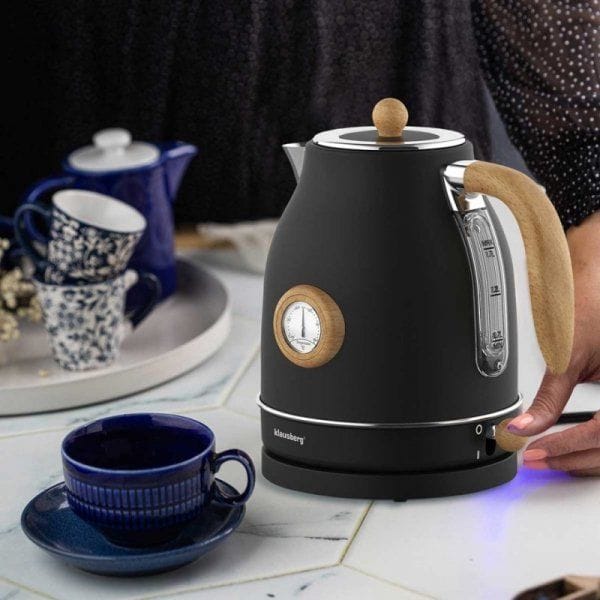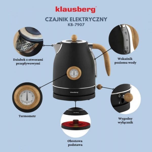 Czajnik elektryczny Klausberg w eleganckim czarnym kolorze z drewnianymi akcentami to połączenie funkcjonalności i ponadczasowego designu. Wyposażony w praktyczny termometr, pozwala na podgrzewanie wody do idealnej temperatury – nie tylko na wrzątek, ale także do kawy, herbaty czy naparów wymagających niższej temperatury. Dzięki mocy 1850–2200 W gotowanie przebiega błyskawicznie, a pojemność 1,7 l sprawia, że czajnik jest idealny zarówno dla jednej osoby, jak i całej rodziny.