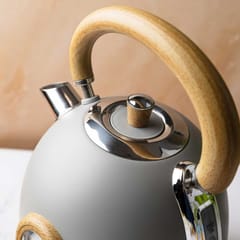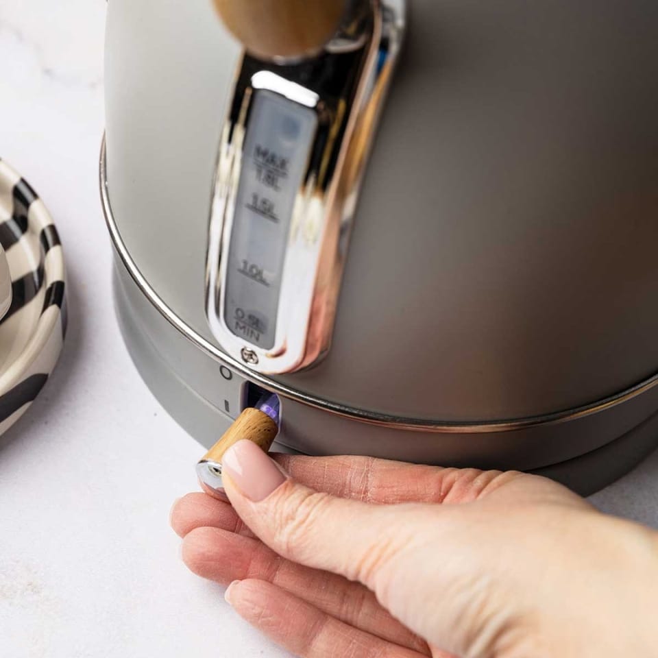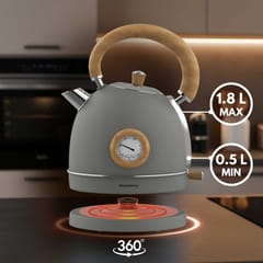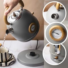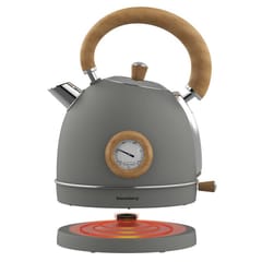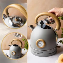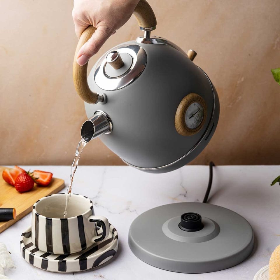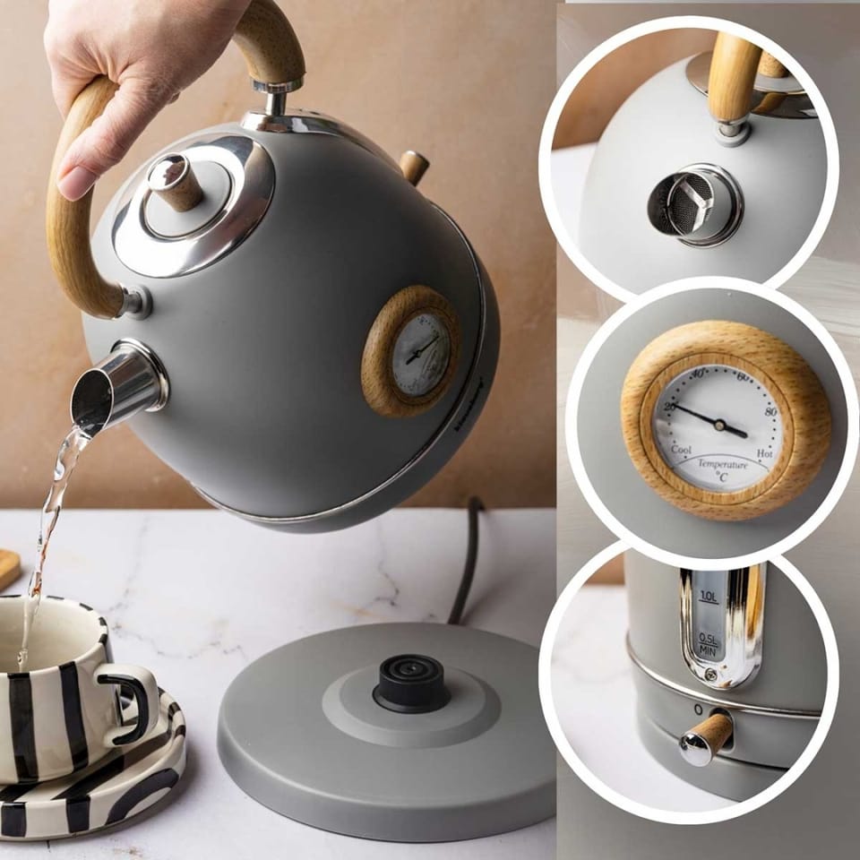 Ten model wyróżnia się nie tylko funkcjonalnością, ale również dopracowanym designem, który przyciąga uwagę. Szara obudowa zestawiona z drewnianymi detalami oraz wbudowany termometr sprawiają, że czajnik staje się nie tylko praktycznym urządzeniem, ale także stylowym elementem wyposażenia kuchni.