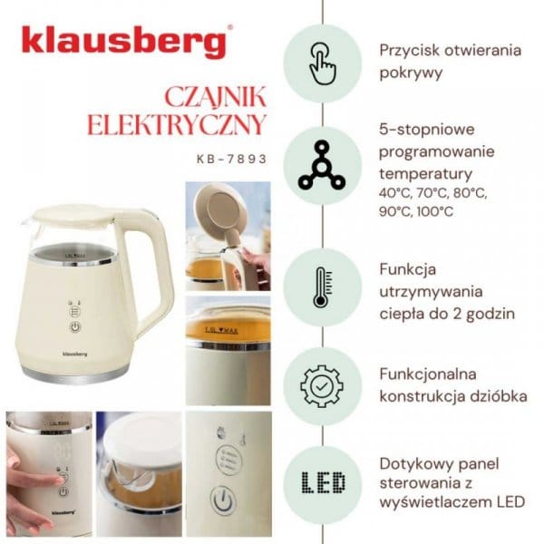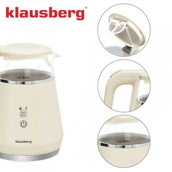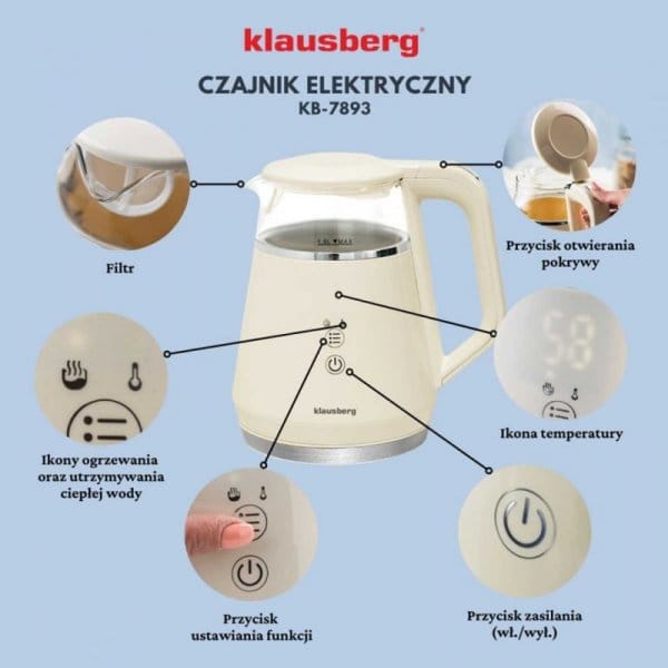 Czajnik elektryczny Klausberg KB-7893 to elegancja i technologia w jednym urządzeniu. Dzięki wyjątkowemu designowi w kolorze kremowym i szklanemu korpusowi stanie się stylowym akcentem w każdej kuchni, a zaawansowane funkcje pozwolą Ci przygotować każdy napój w idealnej temperaturze, szybko i bez wysiłku.