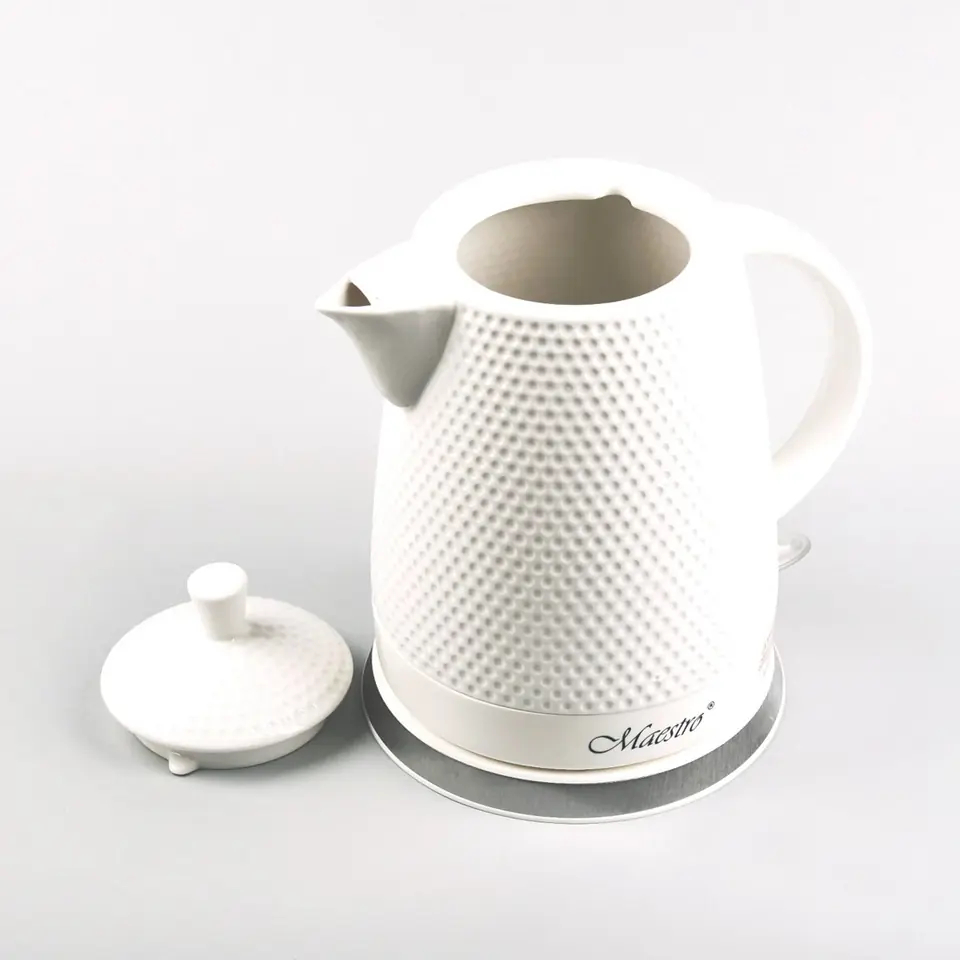 Ceramiczny czajnik elektryczny Maestro MR-069-WHITE to eleganckie i funkcjonalne urządzenie o pojemności 1,5 litra, które idealnie sprawdzi się w każdej kuchni. Z mocą 1500 W czajnik szybko zagotowuje wodę, zapewniając wygodę codziennego użytkowania. Obudowa wykonana jest z wysokiej jakości ceramiki, co nadaje mu nowoczesny wygląd oraz trwałość.