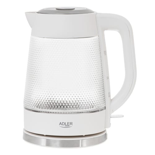 Czajnik elektryczny Szklany czajnik Szkło dekoracyjnePojemność max: 1,8 LPojemność min: 0,5 LPłaska grzałka ze stali szlachetnejBiałe podświetlenieZabezpieczenie przed gotowaniem bez wodyPokrywa całkowicie zdejmowana dla łatwego czyszczeniaFiltr zatrzymujący osady wapniaWskaźnik poziomu wody z podziałkąAutomatyczne wyłączanie Obrotowa podstawa 360°Schowek na przewód zasilającyWymiary produktu: 25,5 x 22,5 x 16,0cmKolor: białyTyp wtyczki: E/FDługość przewodu zasilającego: 70 cmMoc nominalna 1850WMoc maksymalna 2200WZasilanie: 220-240V ~ 50-60Hz