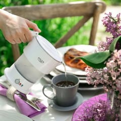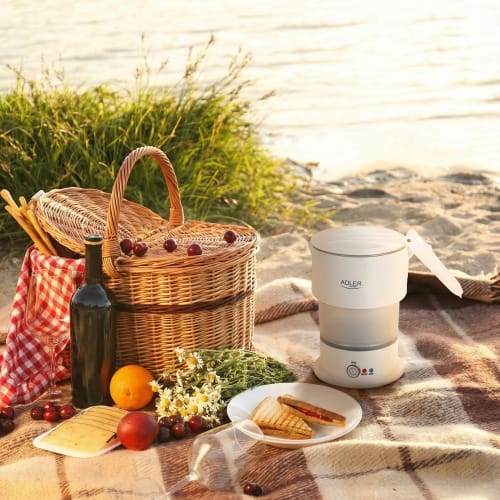 Czajnik silikonowy - turystycznyPojemność max: 0,6 LPojemność min: 0,2 LFunkcja automatycznego podtrzymania temperaturyPłaska grzałka ze stali szlachetnejZabezpieczenie przed gotowaniem bez wodyLampka kontrolnaWytrzymała, składana, silikonowa obudowaSkładana rączkaW komplecie torebka ułatwiająca przechowywanieZintegrowana podstawa Odłączany przewód zasilającyZasilanie: 220-240V ~50/60HzMoc nominalna 600WWymiary produktu: 19,5 x 12,4 x 18,0 cmWymiary złożonego produktu: 14,5 x 12,4 x 9,0 cmKolor: białyTyp wtyczki: E/F Długość przewodu zasilającego: 74 cm