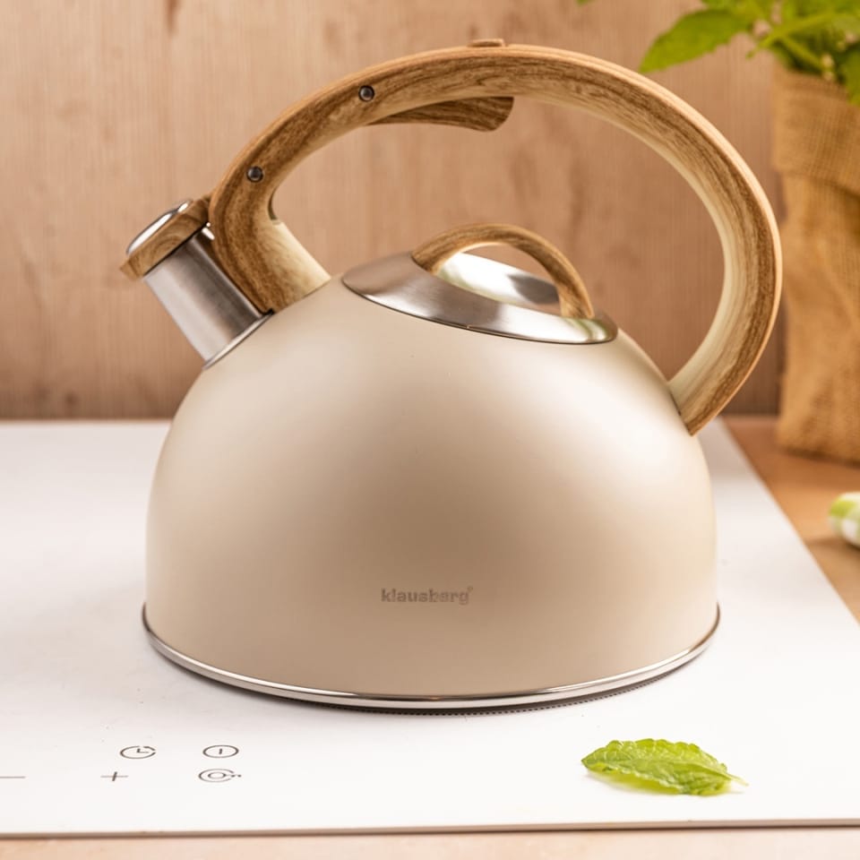 Elegancki czajnik z gwizdkiem w matowym, beżowym kolorze to idealne połączenie nowoczesnego wyglądu i praktyczności. Wykonany ze stali nierdzewnej, doskonale wpisuje się zarówno w stylowe kuchnie, jak i w tradycyjne wnętrza. Jego subtelny design przyciąga wzrok, a solidna konstrukcja zapewnia trwałość na lata.