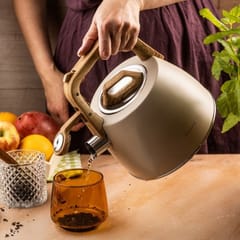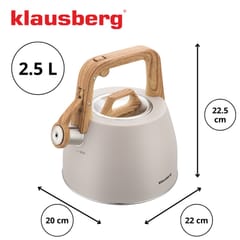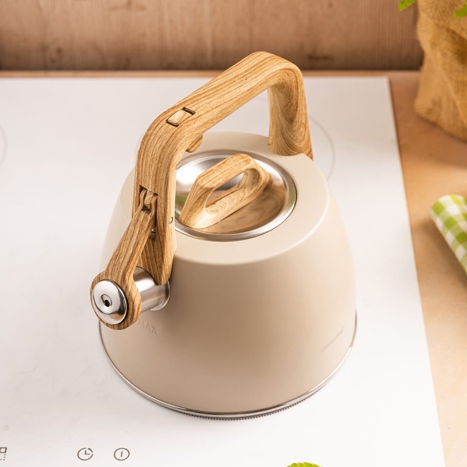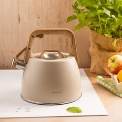 Elegancki czajnik tradycyjny z gwizdkiem w kolorze beżowym to doskonały wybór dla osób ceniących naturalne, stonowane barwy i nowoczesny design. Wykończenie w odcieniu beżu w połączeniu z uchwytem imitującym drewno nadaje mu wyjątkowego uroku i sprawia, że świetnie prezentuje się w każdej kuchni. Idealny do codziennych rytuałów przy kawie i herbacie.