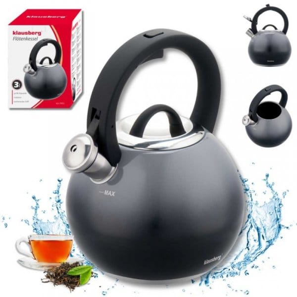 Klausberg KB-7955 to elegancki czajnik o modernistycznym, lekko kulistym kształcie i efektownym grafitowym połysku. Wykonany ze stali nierdzewnej oraz wyposażony w bezpieczny uchwyt, gwizdek otwierany przyciskiem i dno kapsułowe, oferuje połączenie stylu, funkcjonalności i trwałości. Duża pojemność 3 litrów sprawia, że świetnie sprawdza się zarówno w domu, jak i w biurze czy gastronomii.