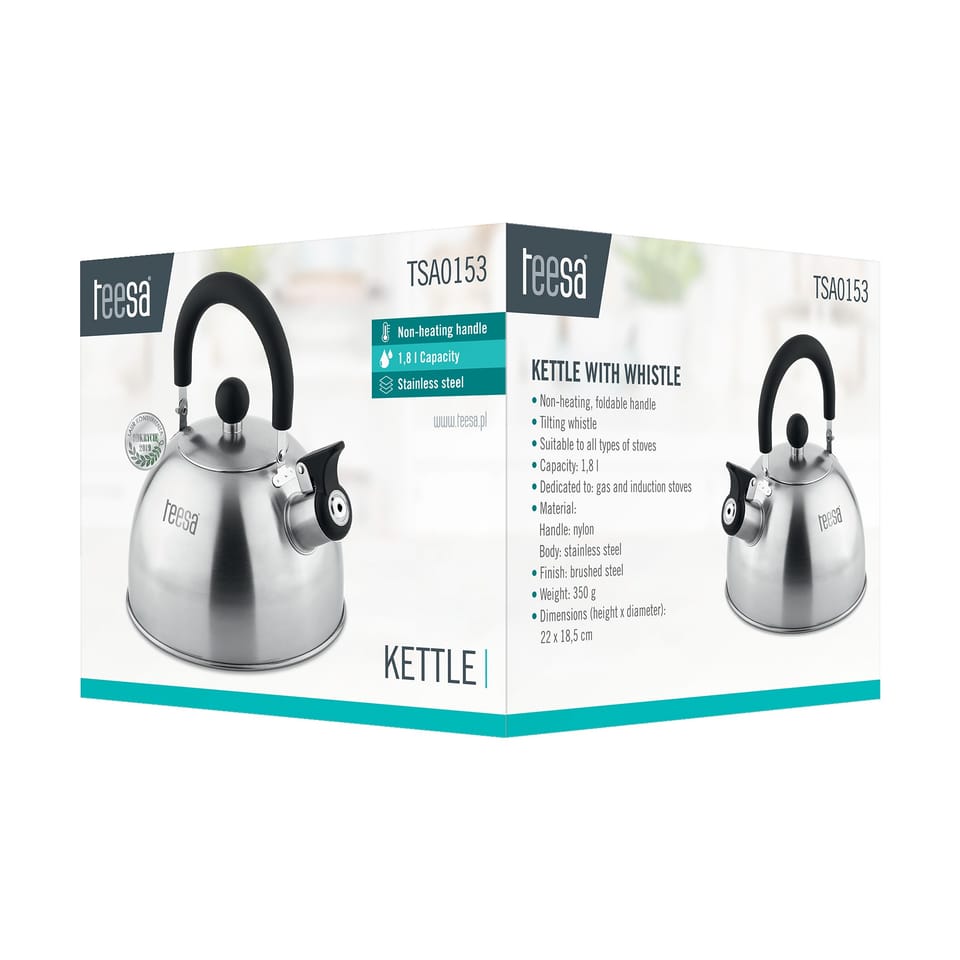 ---------- GŁÓWNE CECHY---------- Nienagrzewający się, składany uchwytOdchylany gwizdekPrzystosowany do wszystkich rodzajów kuchenek---------- DANE TECHNICZNE---------- Pojemność: 1,8 lPrzeznaczenie: kuchenki gazowe i indukcyjneMateriał:Uchwyt: nylonKorpus: stal nierdzewnaWykończenie: szczotkowana stalWaga: 350 gWymiary (wysokość x średnica): 22 cm x 18,5 cm