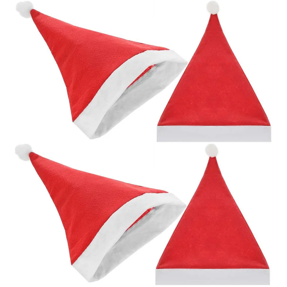 Zestaw 4 Czapek Mikołaja z pomponem to podstawowy gadżet podczas Świąt Bożego Narodzenia. Czapki sa miękkie i miłe w dotyku, zakończone białym, puchatym pomponem, zakończone szerokim białym paskiem. Nosząc takie czapki bez trudu wprowadzisz z rodziną świąteczny nastrój do Swojego domu.