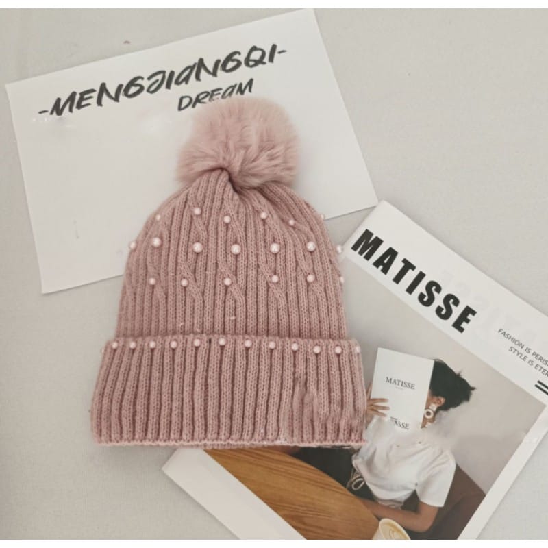 Czapka zimowa dzianinowa z pomponem i perełkami pudrowy róż CZ35WZ1