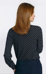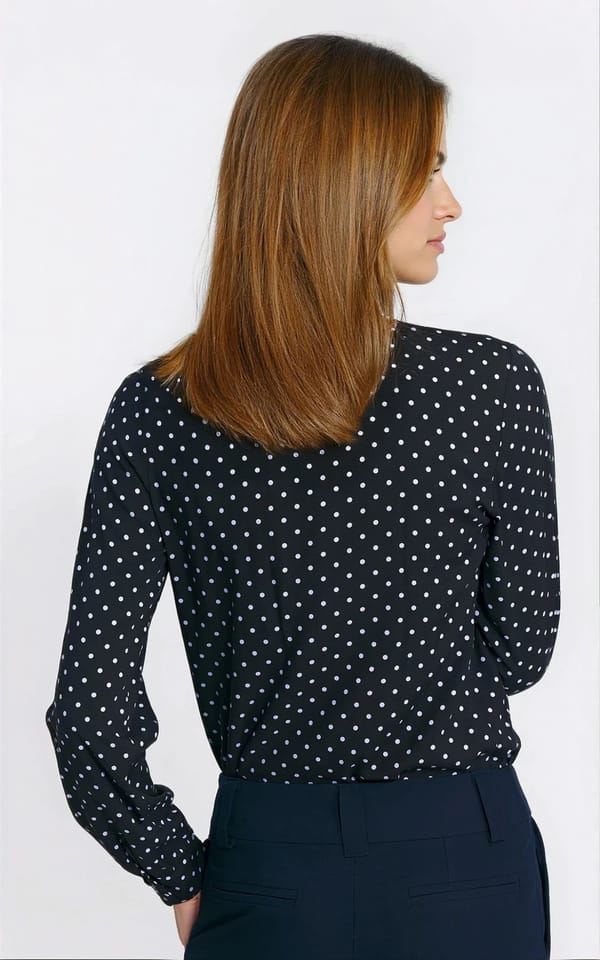 Kolejna jesienna propozycja, to bluzka o prostym fasonie z długimi rękawami, które są zakończone mankietami a dekolt stójką w urocze groszki. Doskonale sprawdzi się w garniturowych zestawach w różnych kolorach – to idealna baza biznesowych stylizacji. Dodatkowym atutem jest materiał - 100% wiskozy, dzięki któremu będziesz czuć się komfortowo przez cały dzień. Skład: 100% wiskoza. Modelka na zdjęciu ma 176 cm wzrostu i ma sobie rozmiar 36.