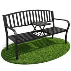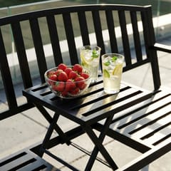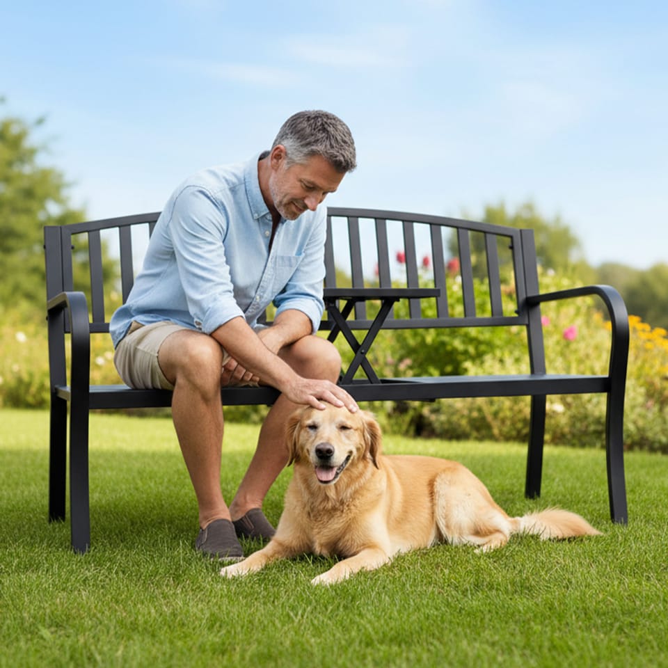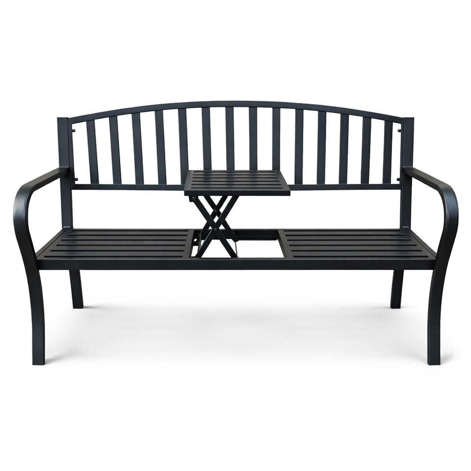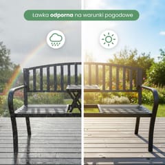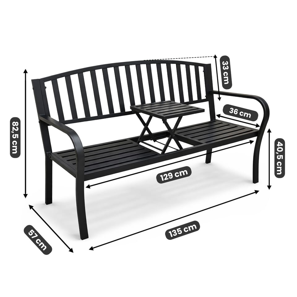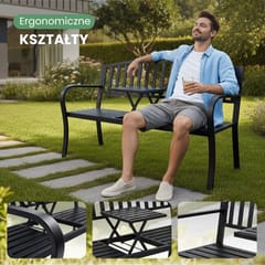 Czarna ławka ogrodowa DUO ze stalowymi nogami I oparciem szerokość 135 cm