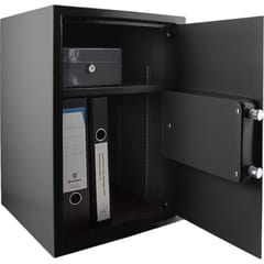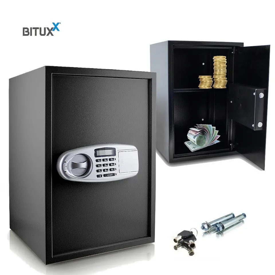 DUŻY SEJF ELEKTRONICZNY - CZARNYSejf z zamkiem elektronicznym wykonany jest z najlepszej jakości stali pomalowaną proszkowo czarną farbą. Posiada również ponadczasowy i nowoczesny zamek, a wszystko to sprawia, że jest wykonany tak, aby posłużył długie lata w atrakcyjnej cenie.
