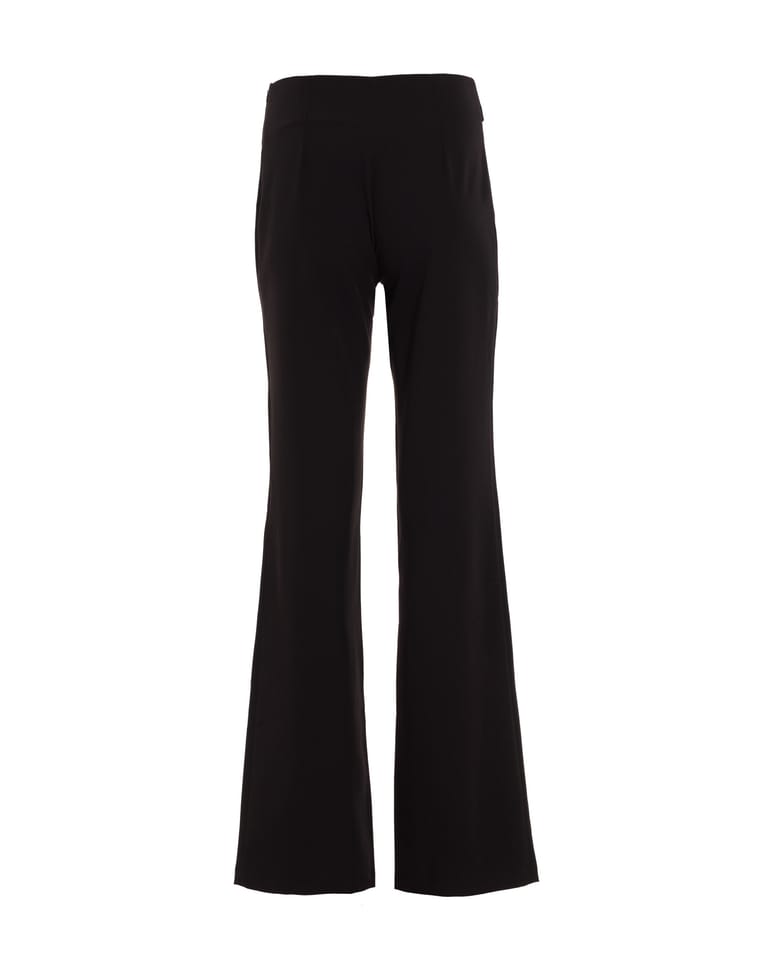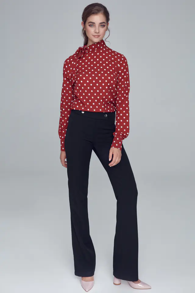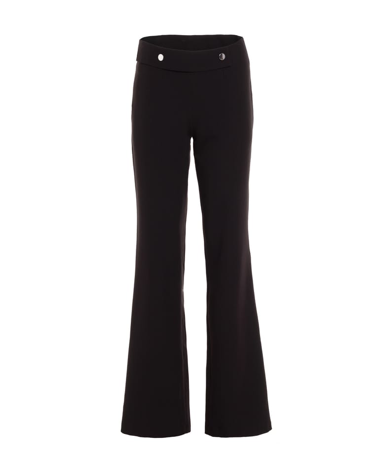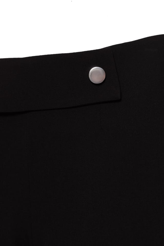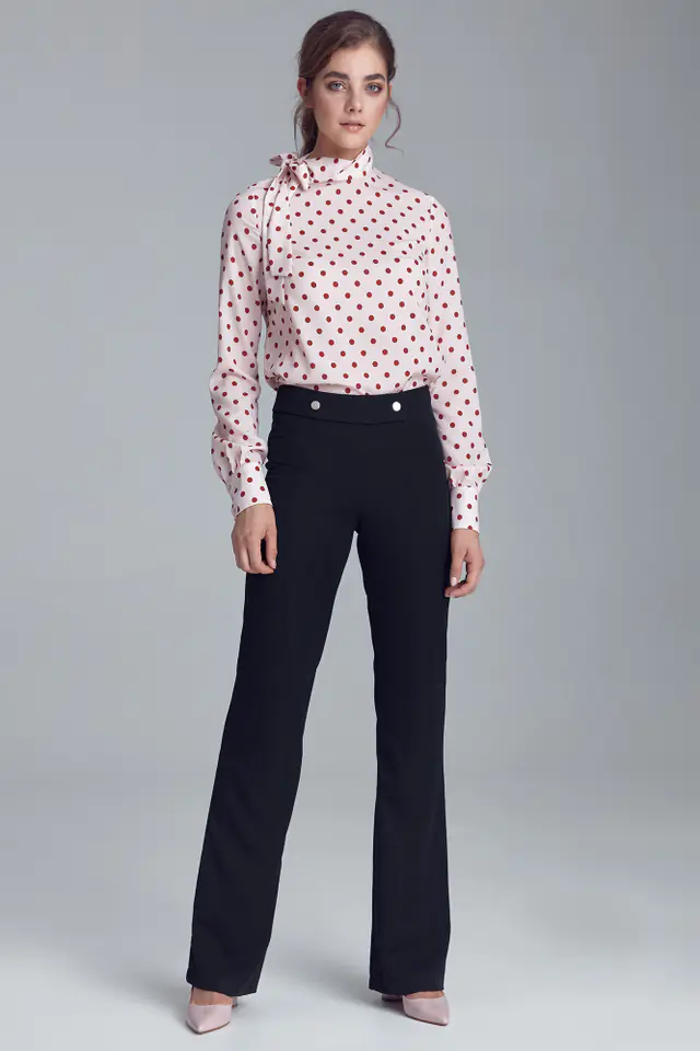 Stylowe spodnie damskie w stylu soft office o prostym kroju z ozdobnymi napami na pasku. Model tworzy razem z wydłużoną marynarką kompletny garnitur. Czarne spodnie doskonale prezentują się także solo lub w duecie z koszulą jak i lekkim, jesiennym swetrem. Skład: 74,8% poliester, 23,1% wiskoza, 2,1% elastan. Modelka na zdjęciu ma 176 cm wzrostu i ma na sobie rozmiar 36.