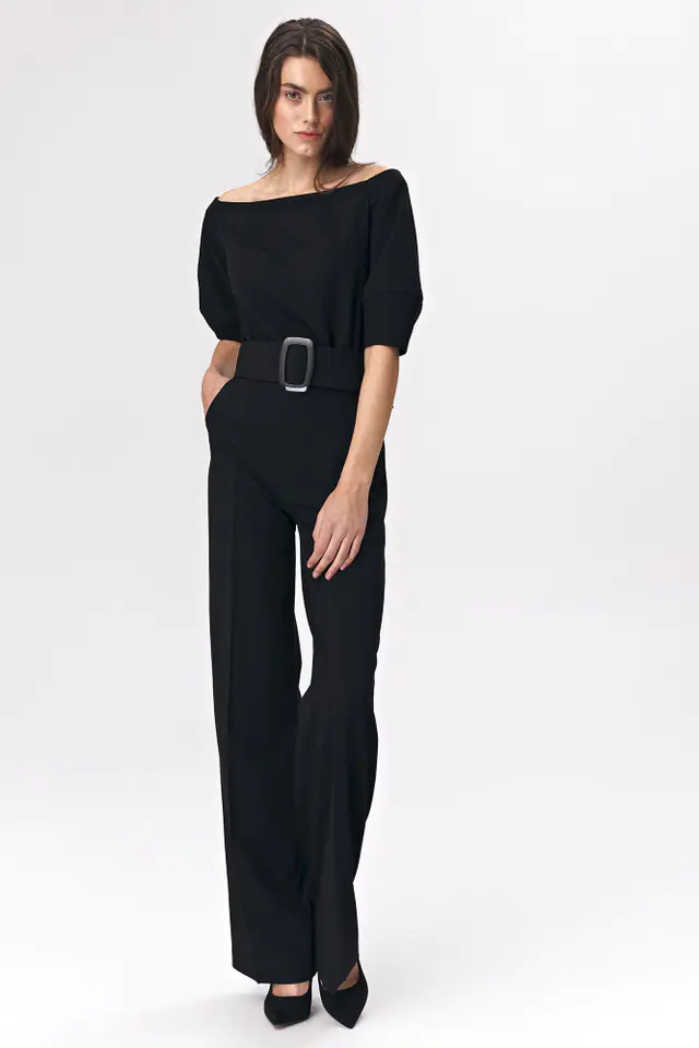 Czarny kombinezon damski to doskonała alternatywa dla klasycznych stylizacji biurowych. Zmysłowy fason cold-shoulder pięknie eksponuje linię ramion, a szeroki pas z efektowną klamrą efektownie podkreśla talię. Przyjemny w dotyku materiał, z domieszką wiskozy, zapewnia wysoki komfort noszenia. Skład: 60% poliester, 35% wiskoza, 5% elastan Modelka na zdjęciu ma 176 cm wzrostu i ma na sobie rozmiar 36.