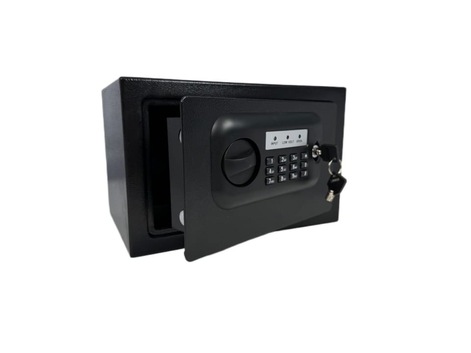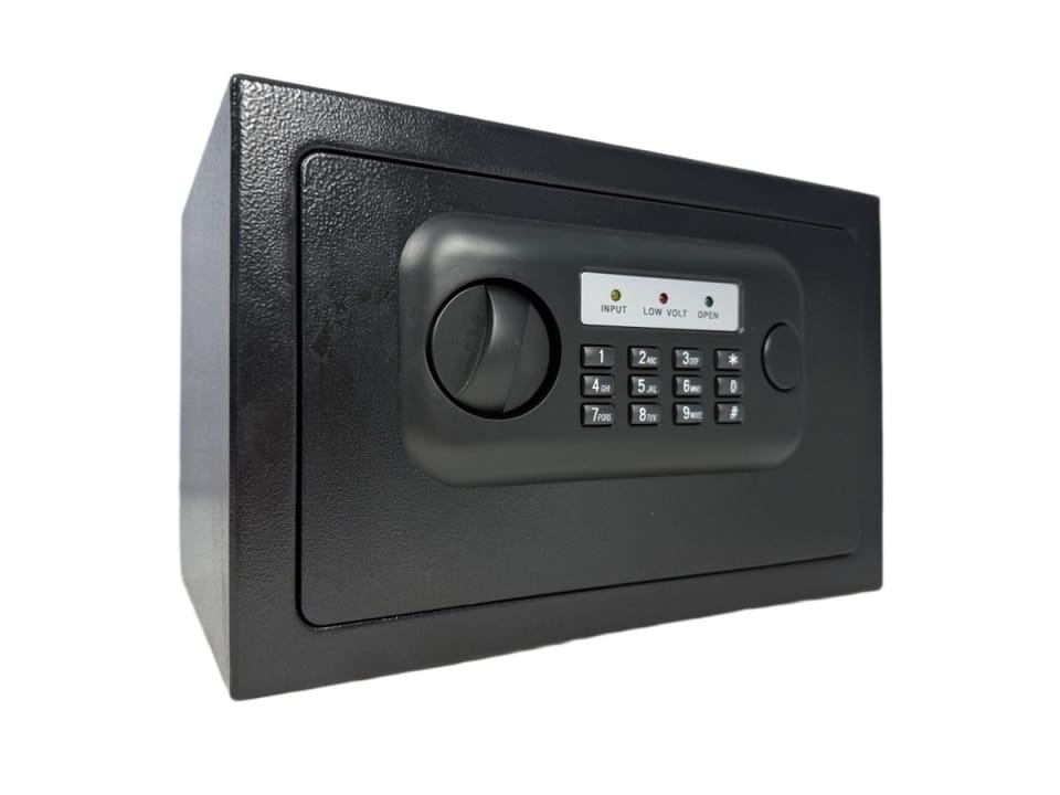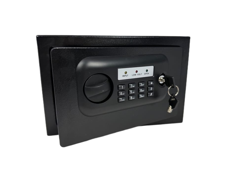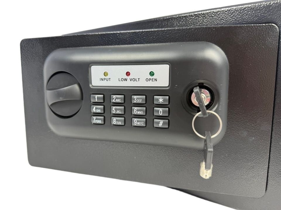 - Podwójny system zamykania – sejf otwierany kodem szyfrowym lub kluczem (zapasowym),