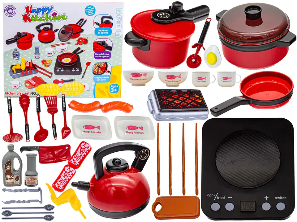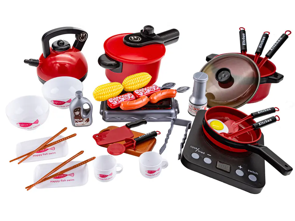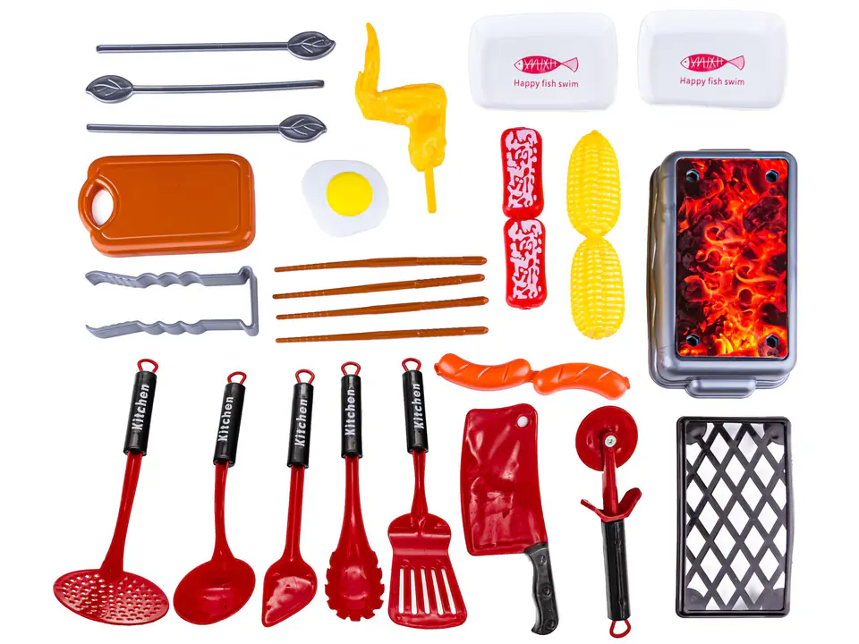 Zestaw zawiera:Czajnik, Patelnię, Garnek z przykrywką, Szybkowar,Płytę grzewczą,Deskę do krojenia,Grill z rusztem, 3 patyczki do grilla,4 patyczki do sushi, 2 kubeczki, 2 półmiski na sushi, 2 miseczki na sos sojowy,Tasak, Łopatkę, Durszlak, Chochlę, Szpatułkę, Łyżkę do makaronu, Nóż do pizzy,Mleko czekoladowe, Ketchup, Jajko, Kukurydza, Kiełbaska, Steki, Skrzydełko kurczaka,Oryginalne opakowanie.