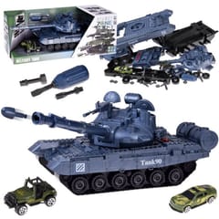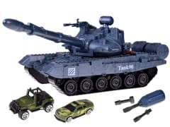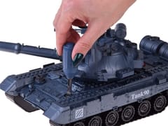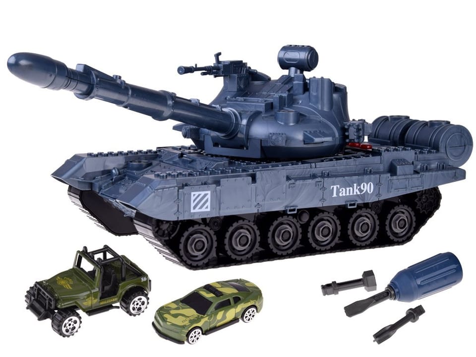 Czołg do składania z pewnością zachwyci każdego fana tych potężnych pojazdów. Model jest w całości wykonany z plastiku, utrzymanego w szarej kolorystyce. Czołg został wyposażony w napęd typu Friction Power, który sprawia, iż poprzez napędzenie pojazdu sam porusza się do przodu na płaskiej powierzchni. Czołg dodatkowo posiada funkcje dźwiękowe i świetlne, wyrzutnię pojazdów a także strzela pociskiem. Jednak największą atrakcją jest możliwość składania i rozkładania modelu za pomocą dołączonego śrubokręta z wymiennymi końcówkami. Samodzielne skręcenie czołgu od podstaw to nie lada wyzwanie dla małego inżyniera-mechanika. Wszystko to sprawia, że zabawa jest niezwykle ciekawa i zajmująca.Zestaw zawiera:- elementy do zbudowania czołgu,- śrubokręt z trzema końcówkami, - 2 autka wojskowe. Atrakcje pojazdu:- możliwość skręcania i rozkręcania pojazdu,- efekty dźwiękowe i świetlne- na dachu kabiny zamieszony jest panel z czerwonymi przyciskami pod którymi kryją się odgłosy jazdy, alarmu, walki, strzelania. Dźwiękom towarzyszą migające czerwono-niebieskie diody,- kabina czołgu jest podnoszona, - wewnątrz pojazdu znajduje się wyrzutnia pojazdów, wystarczy otworzyć rampę, pociągnąć czarną płytkę do "kliknięcia", ustawić odpowiednio pojazd i nacisnąć guzik a autko pomknie przed siebie z zawrotną prędkością, - obrotowa wieżyczka o 360°,- ruchoma lufa, sterowana za pomocą dźwigni na wieżyczce, - strzelanie pociskiem- wystarczy nacisnąć guzik na lufie, - na pancerzu czołgu znajdują się specjalne pola, na których z klocków można zbudować dodatkowe umocnienia. Pola są kompatybilne z klockami dostępnymi na rynku (brak klocków w zestawie). Wymiary: - czołg ok. 43 cm x 16 cm x 15 cm,- autko ok. 7 cm x 3 cm x 2 cm. Zabawa z czołgiem rozwija motorykę dziecka, pozwala na rozwijanie takich umiejętności, jak koncentracja, zdolności manualne, praca z narzędziami. Zabawka zasilana jest bateriami (3x AG13) - dołączone do zabawki.Zestaw zapakowany kolorowe, otwarte pudełko, idealnie nadające się na prezent.
