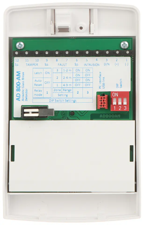 AD800-AM to nowoczesny detektor z funkcją aktywnego antymaskingu, wykrywający wszelkie próby włamania przez okna lub oszklone elementy ścian i drzwiDetektor zbudowany jest w oparciu o najnowszą technologię z dziedziny mikrokontrolerów z oprogramowaniem uwzględniającym wiele czynników związanych z akustyką pomieszczenia (cyfrowa kompensacja akustyki pomieszczenia DRC), co umożliwia precyzyjne rozróżnienie dźwięku zbicia szyby od innych dźwięków