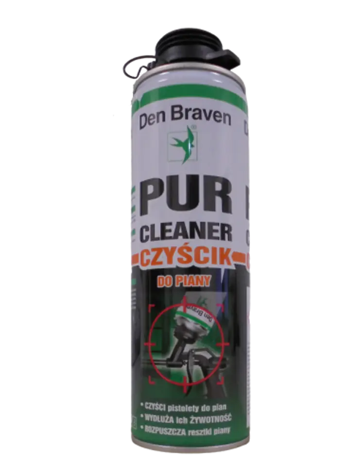 Den Braven Czyścik do piany poliuretanowej to uniwersalny środek czyszczący w aerozolu na bazie acetonu, do czyszczenia pistoletów do pianki, a także do usuwania zabrudzeń ze świeżej, nie utwardzonej piany.