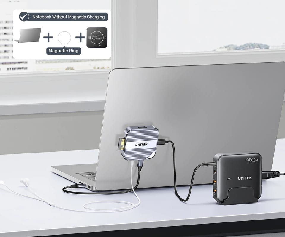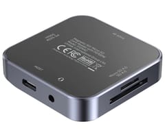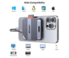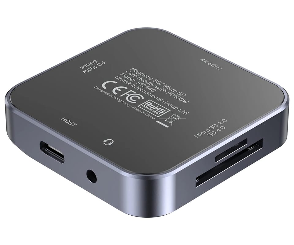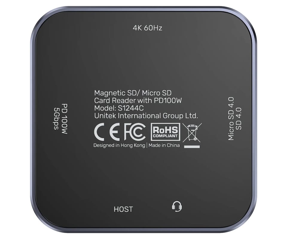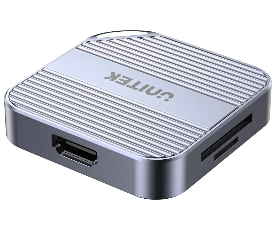 UNITEK S1244CGY01 to kompaktowy czytnik kart pamięci na USB-C. Został zaprojektowany do mobilnej pracy z materiałem wideo – dzięki magnetycznej konstrukcji może być stabilnie mocowany do urządzeń wyposażonych w system MagSafe i wykorzystywany m.in. do bezpośredniego zapisu nagrań na kartę pamięci. Obsługuje jednocześnie karty SD oraz microSD (w tym UHS-II, wstecznie UHS-I, do 2 TB) z możliwością równoległego odczytu/zapisu i kopiowania między kartami. Dodatkowo urządzenie oferuje wyjście HDMI 4K@60 Hz, wyjścia audio/mikrofon oraz port USB-C do transmisji danych 5 Gb/s i przejścia ładowania PD do 100W. Czytnik jest kompatybilny z systemami Windows, macOS, Linux, Android, iPadOS i iOS.