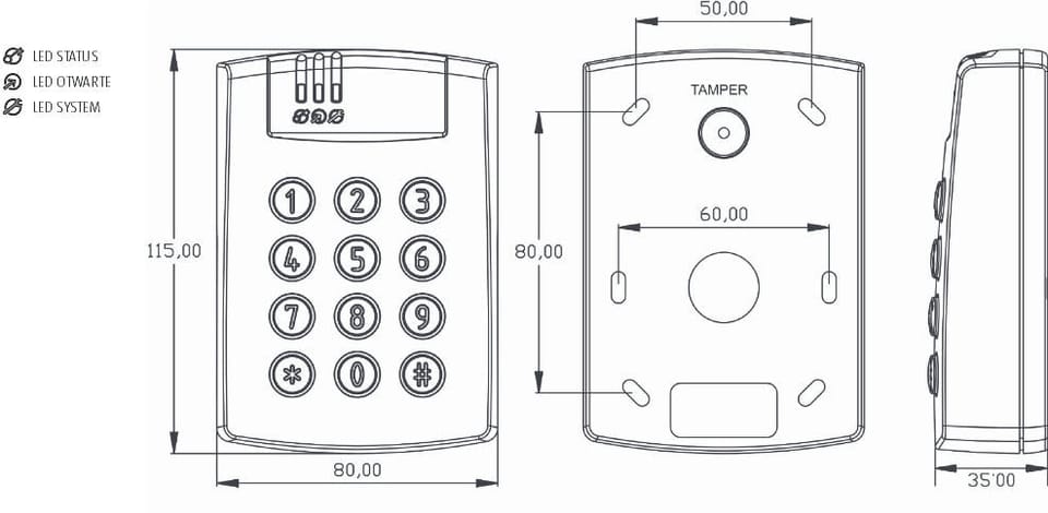 | Wybrane cechy: | Ochrona antysabotażowa (detekcja oderwania od podłoża oraz otwarcia obudowy) Sygnalizacja LED Sygnał dźwiękowy Różne warianty transmisji kodów PIN oraz kodów klawiatury Osobne wejścia do kontroli wskaźnika LED oraz głośnika Programowanie manualne lub z komputera Podświetlane przyciski klawiatury |