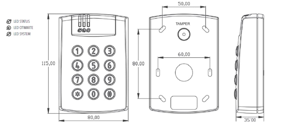 | Wybrane cechy: | Ochrona antysabotażowa (detekcja oderwania od podłoża oraz otwarcia obudowy) Sygnalizacja LED Sygnał dźwiękowy Różne warianty transmisji kodów PIN oraz kodów klawiatury Programowanie manualne lub z komputera Możliwość pracy jako programator kart 13.56 MHz S50 (wymagana bezpłatna wersja programu RARC) 120 zaindeksowanych użytkowników Historia 1024 zdarzeń Programowalne wyjście przekaźnikowe 1.5A/30V Dwa wyjścia tranzystorowe Dwa wejścia NO/NC |