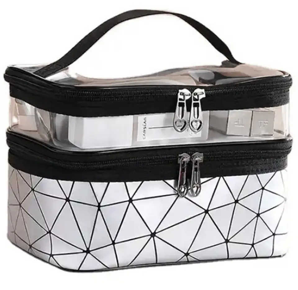 Niezwykle praktyczna kosmetyczka podróżna w formie kuferka. Wyposażona w wiele przegródek o zróżnicowanej wielkości i przeznaczeniu. Dodatkowe kieszenie i schowki ułatwią ukrycie ogromnej ilości kosmetyków. Kuferek został wykonany z solidnego tworzywa, które zabezpiecza zawartość przed przypadkowym uszkodzeniem. Etui posiada zamek błyskawiczny, przezroczystą pokrywkę oraz rączkę ułatwiająca jego wygodne przenoszenie.