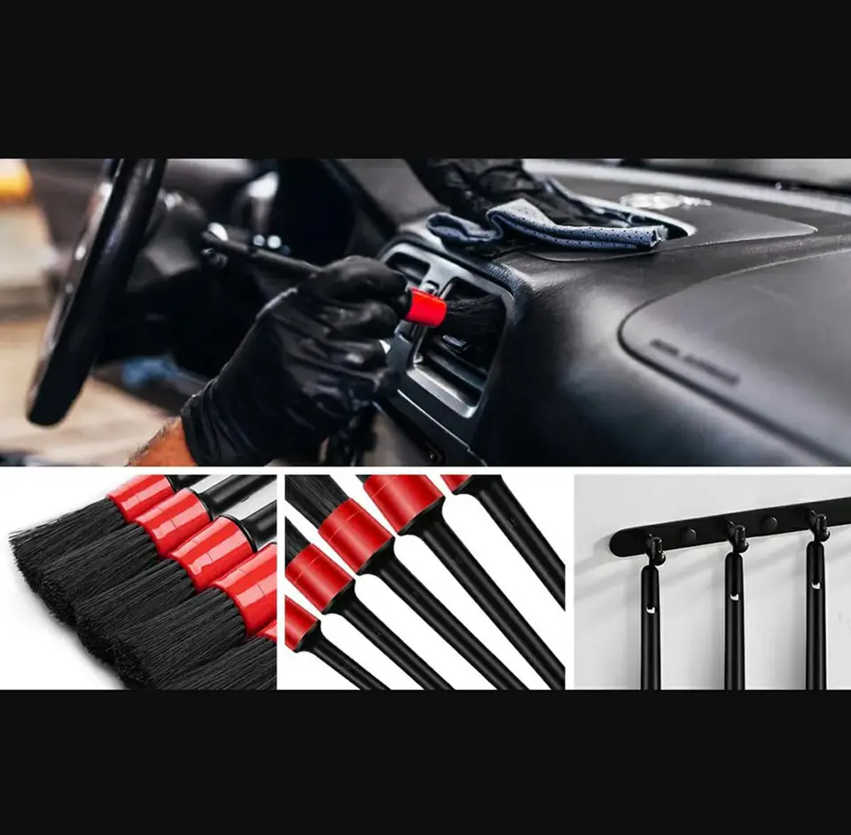 - Zestaw pięciu kompaktowych szczotek do czyszczenia wnętrza samochodu.
