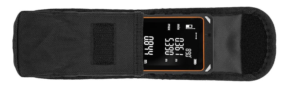 Dalmierz laserowy, IP54, zasięg 0,05 100 m, długość wiązki lasera 620~690 nm, zasilanie 3 baterie alkaliczne typu AAA, pamięć 50 ostatnich pomiarów, II klasa, jednostki miary: m/in/ft, pomiar odległości, pola powierzchni, objętości, pomiar ciągły, Pitagoras, dodawanie i odejmowanie, pomiar maksymalny i minimalny, możliwość pomiaru od początku i końca urządzenia, elektroniczny kątomierz 0-90 stopni, opaska na nadgarstek, etui, baterie