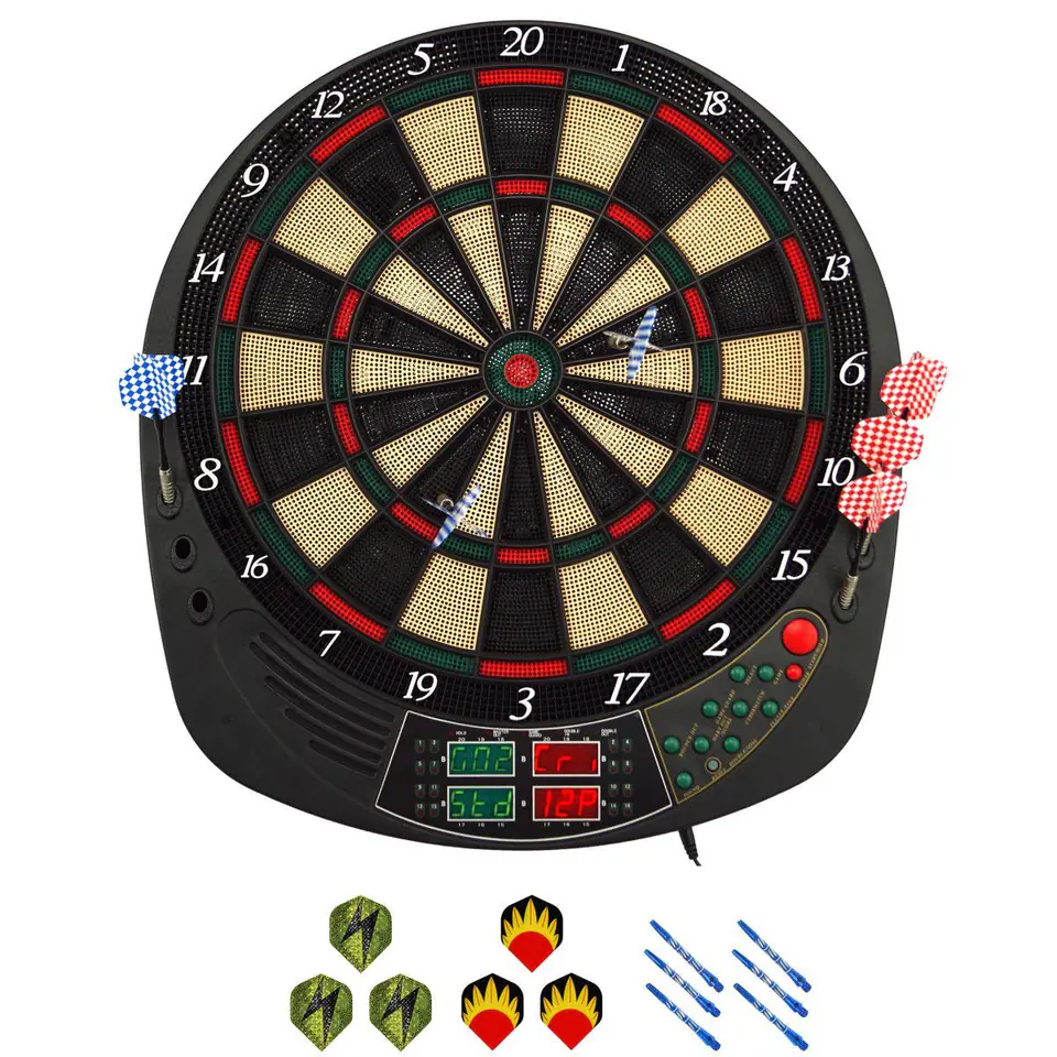 - Wymiar: 43,5 x 3 x 47 cm (szer. x gr. x wys.) Ilość gier: 27 w tym 159 wariantówPrzeznaczenie: 1-16 pojedynczych graczy lub 2 drużyny po 8 osóbWyświetlacz LCD: takSygnalizacja głosowa i dźwiękowa: takTryb cybermatch: takFunkcja Gme Guard (blokowanie klawiszy): takOpcja podwójnego wejścia / podwójnego wyjścia i opcja odbicia: takObliczanie rzutów za zwycięstwo w grach „01”: takZasilanie: zasilacz sieciowy (w zestawie)Długość kabla od zasilacza ok.: 180 cmNapisy i dźwięki na w języku angielskimWaga netto: 1,419 kgWaga brutto: 1,954 kgMateriał: tworzywo sztuczneKolor: wielokolorowyWymiary opakowania: 45 x 5 x 48 cm (szer. x gł. x wys.)Marka: Best SportingZestaw zawiera: zasilacz, tarcza, rzutki – 12 szt., wymienne końcówki