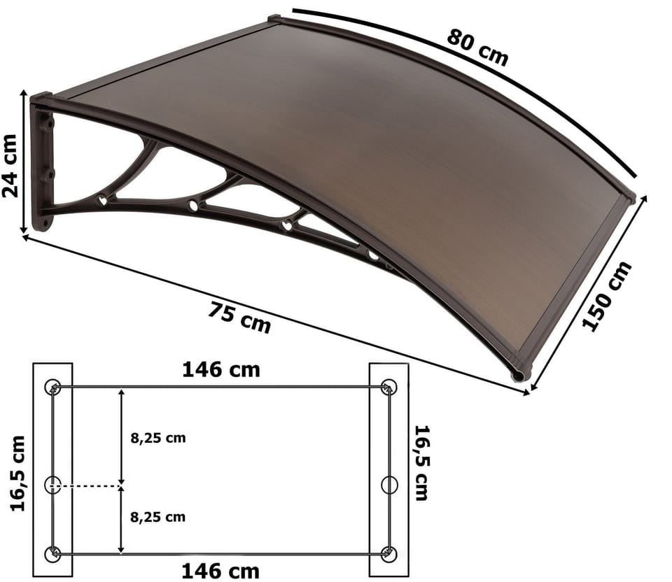 Daszek nad drzwi Eko 80 x 150cm - brązowyKolory: brązowy Praktyczny daszek nad drzwi zapewniający skuteczną osłoną zarówno drzwiom wejściowym jak i osobie, która pod nimi stoi. Zadaszenie nad drzwi wejściowe przystosowane jest do samodzielnego montażu i nie wymaga specjalistycznych narzędzi.Daszek z poliwęglanu jest lekki, wytrzymały i dostępny u nas w bezkonkurencyjnej cenie. Idealnie nadaje się do zadaszenia wejścia do biura bądź domu. Cechy produktułatwy w montażustabilna konstrukcjamocowany jest za pomocą dołączonych śrub ze stali nierdzewnejodporne na promieniowanie UV oraz mrózWymiary produktuSzerokość: 150 cmDługość: 80 cm Informacje dodatkowePrzedstawione kolory należy traktować poglądowo - mogą odbiegać od rzeczywistych ze względu na różne ustawienia monitorów oraz proces obróbki zdjęć. Rzeczywiste wymiary mogą się różnić od podanych wyżej. Tolerancja błędów może wynosić +/- 5%. Marka:GockowiakKod produktu:304839MGKolor:brązDługość: 80 cmSzerokość:150 cmMateiał: poliwęglan, metal, plastikGrubość: 5mm