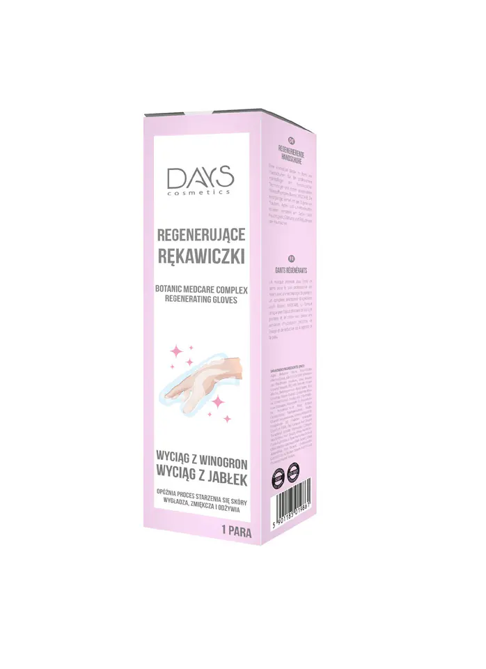 Maska w postaci rękawiczek do profesjonalnej pielęgnacji rąk z zaawansowaną technologią i wyselekcjonowanym kompleksem składników aktywnych Botanic MEDCARE. Unikalna formuła z dodatkiem wyciągu z owoców winogrona, jabłek i limonki, daje odczucie głębokiego nawilżenia, wygładzenia oraz redukcji szorstkości skóry. Wygodna forma daje możliwość oderwania końcówek i aplikację produktu tylko na okolice dłoni, podczas kiedy palce pozostają odkryte. Pozwala to na bezproblemowe wykonywanie codziennych czynności. Oderwane końcówki mogą posłużyć jako nasadki regenerujące dla paznokci oraz skórek dla wzmocnienia efektu, można zaaplikować do nich dodatkowo swój ulubiony produkt do regeneracji. Dzięki kuracji DAYS ręce wyglądają na zdrowe i odżywione.