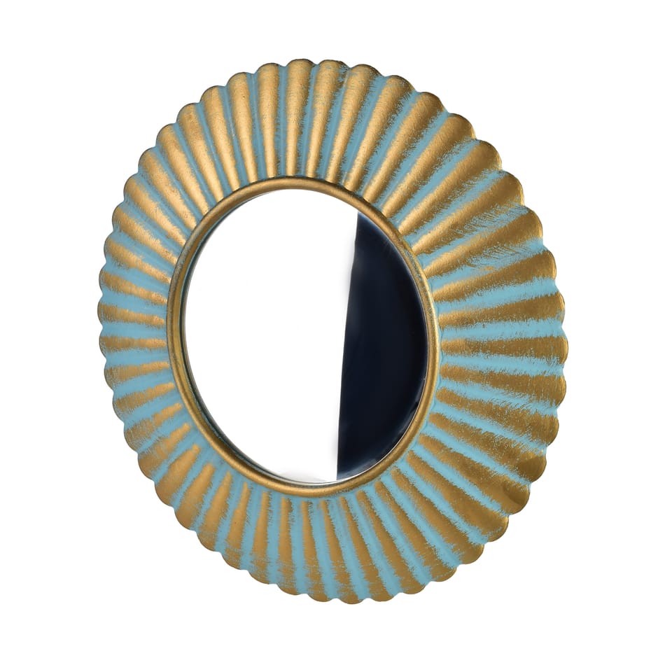 DAZ . Lustro dekoracyjne okrągłe 40 40 3 cm, turkusowo-złote.Stylowe lustro dekoracyjne z kolekcji DAZ marki MONDEX since 1986.Okrągła rama w kolorze turkusowo-złotym z delikatnym efektem przetarcia nadaje całości wyjątkowego charakteru i elegancji.Lustro ma wypukłą budowę, a średnica samej powierzchni odbijającej światło to 21 cm. Doskonale sprawdzi się w każdym wnętrzu . zarówno nowoczesnym, jak i klasycznym. Dodając mu blasku, głębi i stylowego akcentu.zapakowany jednostkowo w brown box i folię bąbelkową.