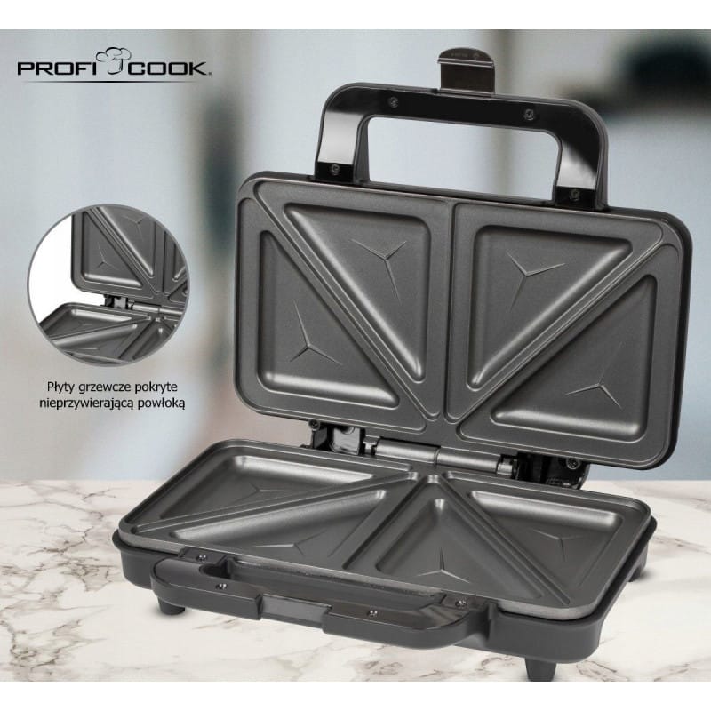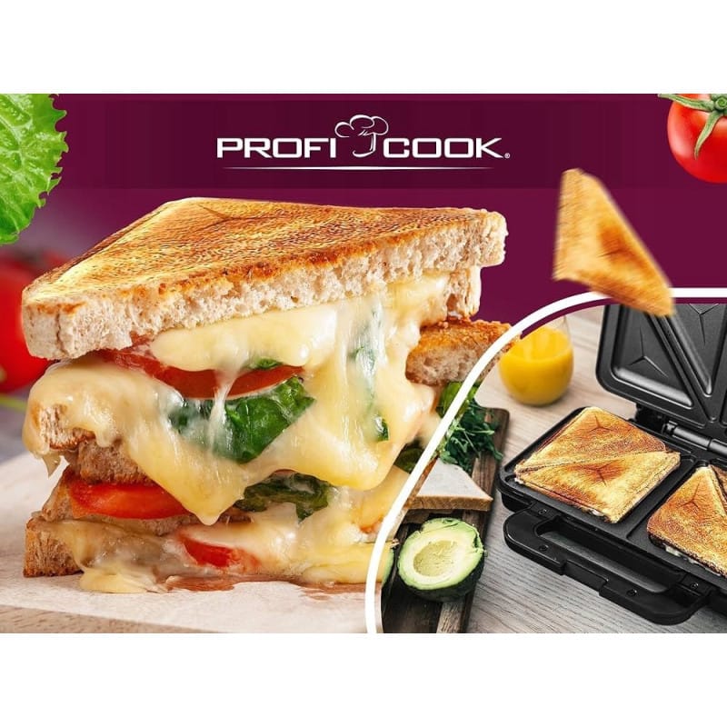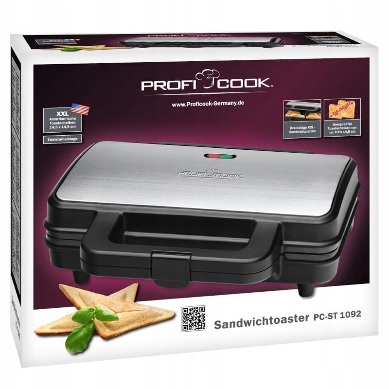NAJWYŻSZEJ JAKOŚCIOPIEKACZ TOSTER SANDWICHDO KANAPEK TOSTÓWRENOMOWANEJ FIRMY PROFICOOKMODEL: PC ST 1092Mocny opiekacz 900W pomoże szybko przygotować pożywne tosty, nawet te amerykańskie w rozmiar XXL.Jeśli nie masz dużych kromek - zrobisz w nim sandwiche ze zwykłego chleba tostowego.Nieprzywierająca powłoka i środek ze stali nierdzewnej - gwarantują bezpieczeństwo i wygodę użytkowania.Kabel zwiniesz w praktycznym i estetycznym schowku u dołu.PYSZNE - AMERYKAŃSKIE TOSTY W ZASIĘGU RĘKI ...Ciepłe, chrupiące tosty na śniadanie, kanapki z pożywnymi dodatkami - dobre rozwiązanie dla każdego. Zwłaszcza, gdy liczy się czas. Teraz przygotujesz je w mig dzięki tosterowi niemieckiej firmy ProfiCook PC-ST 1092.900 W mocy oraz duże pole na kanapki sprawi, że zrobisz w nim typowe sandwiche, a także amerykańskie tosty w rozmiarze XXL.Do przygotowania tostów możesz użyć typowego chleba tostowego (ok. 9 cm) oraz tego w rozmiarze XXL (ok. 14.cm). Nieprzywierająca powłoka, którą pokryte są płytki grzewcze, pozwalają na łatwe czyszczenie.Na uwagę zwraca praktyczny schowek na kabel, który znajduje się u spodu. Gdy opiekacz nie pracuje, możesz postawić go w pionie, na blacie, a kabel nie będzie ci się plątał pod rękami. Estetycznie i bezpiecznie przechowasz go na wierzchu lub w szafce.Najważniejsze cechy opiekacza do tostów, do kanapek, sandwichów ProfiCook PC-ST 1092:Wnętrze ze stali nierdzewnejDuże płytki kanapkowe do chleba tostowego XXL, do amerykańskich tostów XXLNadaje się do tostowych kromek wielkości ok. 9 cm do 14,5 cm (rozmiar pola na kanapkę: ok. 14,5 cm x 14,5 cm)Płytki grzewcze są pokryte nieprzywierającą powłokąIzolowany termicznie uchwyt Cool TouchAutomatyczny regulator temperatury2 lampki kontrolne do zasilania i ogrzewania (oznaka pieczenia)Wysoka stabilność dzięki gumowanym nóżkomSystem zamykaniaOchrona przed przegrzaniemSchowek na przewód220-240 V, 50/60 Hz, 900 W Produkt został odznaczony certyfikatem FOCUS - TEST DEUTSCHLANDS BESTECertyfikat TEST DEUTSCHLANDS BESTE został przyznany na podstawie badań przeprowadzonych przez „Germanys best household electronics”. W ramach testu porównane zostały produkty wybrane z ponad 20 000 marek z 274 segmentów rynkowych.Celem wyróżnienia „Focus” jest wskazywanie produktów cieszących się największym uznaniem konsumentów. Certyfikat przyznany jest na podstawie badań niemieckiego rynku i potwierdza wysoką jakość produktów a także świadczy o dużym zaufaniu konsumentów i renomie marki.slimtex