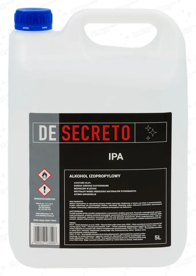 De Secreto IPA – alkohol izopropylowy to najczęściej używany środek czyszczący. Bezpieczny w użyciu oraz łatwy w przechowaniu. Szybko odparowuje, nie pozostawiając śladów i zabrudzeń. Neutralny wobec większości materiałów stosowanych w motoryzacji, optyce, elektrotechnice, przemyśle precyzyjnym czy elektronice.