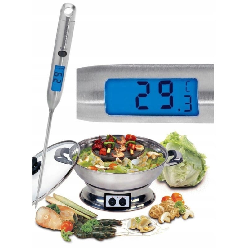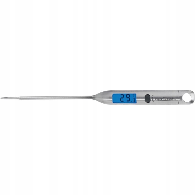 NAJWYŻSZEJ JAKOŚCITERMOMETR SZPILKOWYDO MIĘSA, ŻYWNOŚCIRENOMOWANEJ FIRMY PROFICOOKMODEL: PC-DHT 1039Termometr szpilkowy ma szerokie zastosowanie. Może być wykorzystywany zarówno do celów kuchennych (np. mierzenie temperatury mięsa, mleka, herbaty, grilla itp.), jak i przy tworzeniu własnoręcznych świec.Termometr pozwala bowiem precyzyjnie mierzyć temperaturę topnienia wosków oraz parafin dokonując dokładnego pomiary temperatury w naczyniu. Uzyskane wyniki są wyświetlane na wyświetlaczu LCD.Cyfrowy termometr kuchenny PROFI COOK PC-DHT 1039 to urządzenie niezbędne w Twojej kuchni. Jeśli jesteś perfekcjonistką w gotowaniu i przyrządzaniu potraw, doskonale wiesz, jak ważna jest kontrola ich temperatury.Dzięki cyfrowemu termometrowi idealnie upieczesz mięso i ryby, a także schłodzisz odpowiednio napoje. Niezawodny termometr PROFI COOK PC-DHT 1039 to Twoje wsparcie w kuchni.Trwałość urządzenia gwarantuję wykonanie ze stali nierdzewnej. Szybki czas pomiaru i zarazem jego duża dokładność pozwolą Ci idealnie upiec mięso i mieć przez cały czas pod kontrolą proces jego obróbki.Urządzenie zapamięta ostatni pomiar, dzięki czemu będziesz mogła porównać temperatury. Termometr cyfrowy nie zajmie dużo miejsca w Twojej kuchni (możesz go powiesić za praktyczne uszko na wieszaku), a zawsze będziesz go miała pod ręką.Elektroniczny termometr LCD mierzy temperaturę mięs, cieczy, ciast itp.Elektroniczny termometr LCD służy do mierzenia temperatury mięs, cieczy, ciast, grilla itp. Pozwala on na wygodną kontrolę temperatury dowolnego produktu. Jest idealny w kuchni podczas gotowania aby sprawdzić temperaturę gotowanej potrawy.Wyświetlacz LCD, który jest łatwy do odczytu, dokładne wyświetla temperaturę w stopniach Celsjusza lub Fahrenheita. PARAMETRY TECHNICZNE:Cyfrowy termometr kuchenny, idealny do przygotowania gotowanych potraw, takich jak pieczenie, mięsa, ryby oraz napojów, takich jak wino, szampan, wino musująceStal nierdzewnaZakres temperatury: od –45° C do 200° CSzybka reakcja i czas pomiaruWysoka dokładność pomiaruMożliwość wyświetlania temperatury w °C oraz w F°Funkcja zapamiętywania ostatniej odmierzonej temperaturyWyświetlacz LCD (podświetlony na niebiesko)W zestawie silikonowa osłonka zabezpieczającaW zestawie praktyczne uszko do zawieszaniaZasilanie bateryjne: bateria guzikowa (LR44) (bateria w zestawie)Waga: 0,051kgSLIMTEX