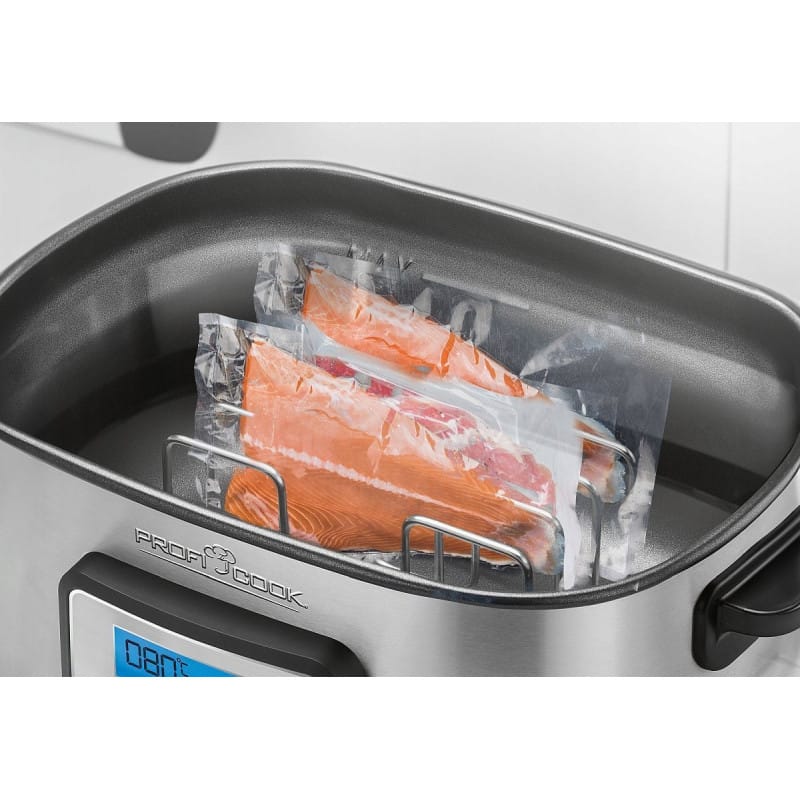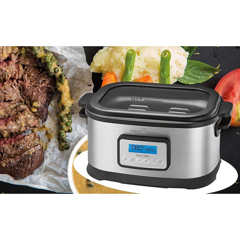 NAJWYŻSZEJ JAKOŚCICYRKULATORURZĄDZENIEDO GOTOWANIA SOUS VIDERENOMOWANEJ FIRMY PROFICOOKMODEL: SV-1112ProfiCook SV-1112 to wysokiej jakości cyrkulator do gotowania Sous-Vide. Innowacyjna technika sous-vide stosowana jest w najlepszych, pięciogwiazdkowych restauracjach na całym świecie.Polega na powolnym gotowaniu produktów zapakowanych w woreczki próżniowe, dzięki czemu nie tracą one zapachu, smaku i koloru, a z nimi wartości odżywczych.Nie towarzyszy też temu zapach gotującego się jedzenia w pomieszczeniu. Do gotowania nie potrzebna jest już kuchenka. Wystarczy, że wypełnisz urządzenie wodą i umieścisz w niej zapakowane produkty. Dzięki zastosowaniu metody gotowania sous vide potrawy dłużej zachowują świeżość, ponieważ podczas takiego gotowania są one pasteryzowane.Sous vide to nowoczesna metoda gotowania, która szturmem zdobywa cały świat. Jej nazwa pochodzi z języka francuskiego, a w dosłownym tłumaczeniu oznacza „w próżni”.W wielu krajach na całym świecie sous vide przestaje być pojęciem nowym, gdyż technikę tę prezentuje się w programach telewizyjnych, przepisach kucharskich, a wyjątkowo często stosowana jest w dobrych restauracjach.Dlaczego tak się dzieje Bez wątpienia ogromny wpływ na taki rozwój sytuacji ma fakt, że potrawy przygotowane tą metodą są wyjątkowe, wykwintne, charakteryzuje je niepowtarzalny smak i jakość.Najważniejsze cechy urządzenia do gotowania Sous-Vide ProfiCook PC-SV:Technika gotowania Sous-Vide: próżniowa metoda długiego gotowania potraw w szczelnie zamkniętych workach plastikowych, umieszczonych w gorącej wodzie. Celem metody jest zachowanie naturalnego smaku i jakości żywności.Obudowa ze stali nierdzewnejPrecyzyjne gotowanie żywności dzięki elektronicznej regulacji temperatury (maks. Odchylenie +/– 0,5 °C)Zachowuje witaminy, składniki odżywcze i aromatFunkcja delikatnego gotowania, przygotowywania jogurtu i utrzymywania ciepłaWyświetlacz LCD (niebieskie podświetlenie)Regulacja temperatury: 45°C – 90°C72-godzinny timerPojemność: 8,5 lNaczynie do gotowania (nieprzywierająca powłoka)Duże okno rewizyjne w pokrywieZestaw zawiera szczypce i kratkę ze stali nierdzewnej do układania żywności przed gotowaniemZasilanie sieciowe: 230 V, 50 Hz, 520 WDo pakowania próżniowego polecamy: zgrzewarkę ProfiCook PC-VK 1080Temperatura wody ma kluczowe znaczenie w gotowaniu metodą sous vide, a za sprawą cyrkulatora można ją bardzo precyzyjnie określić i utrzymać na stałym poziomie.Standardowe zakresy temperatur:Wołowina medium-rare: 54-59°CWołowina medium: 60-63°CPierś z kurczaka: 60-66°CSoczysta, krucha wieprzowina: 52-68°CTradycyjna ryba: 50-56°COkreślenie czasu pełnego ogrzania pożywienia metodą sous vide jest dość łatwe, ponieważ woda posiada stałą temperaturę. Około godziny zajmuje ogrzanie kawałka mięsa o grubości 2,5 cm, następne 2,5 cm to dodatkowe 2 godziny. Przy zastosowaniu metody sous vide nie ma możliwości, aby doszło do przegrzania potrawy, przetrzymanie przez 2-3 godz. ponad potrzebny czas nie robi większej różnicy.Przykładowe rekomendacje doboru czasu:wołowina: od 30 minut do 4 godzinTwarda wołowina: od 3 do 24+ godzinDelikatna wieprzowina: od 45 minut do 8 godzinTwarda wieprzowina: od 3 do 48 godzinMięso z kurczaka: od 30 minut do 8 godzinRyby: od 10 minut do 3 godzinProfi Cook SV-1112 to urządzenie do sous-vide, który pozwoli Ci czerpać maksimum korzyści z tej metody gotowania potraw.Jakie są zalety sous-vide Są to przede wszystkim:równomierne gotowanie i zatrzymanie zawierających przez żywność płynów.Efektem jest delikatna i soczysta potrawa, pełna smaku, aromatu i cennych wartości odżywczych. Dodatkowym plusem jest brak rozprzestrzeniania się zapachów jedzenia po całej kuchni albo i po całym mieszkaniu. Taki mały sprzęt AGD do kuchni jest więc obowiązkowym akcesorium w mieszkaniu osób, które przywiązują dużą wagę do tego, co jedzą. A dlaczego warto zainteresować się akurat modelem ProfiCook SV-1112 Niezaprzeczalną zaletą jest też czytelny wyświetlacz elektroniczny, który pozwala czuwać nad tym, czy gotowanie odbywa się zgodnie z planem.Jedzenie jak w restauracjiTechnika stosowana jest w najlepszych, pięciogwiazdkowych restauracjach na całym świecieBez dodatkowych urządzeńDo gotowania nie potrzebna jest już kuchenka - wystarczy urządzenie oraz zapakowane próżniowo produktyZdrowe gotowaniePowolne gotowanie produktów zapakowanych w woreczki próżniowe sprawia, że nie tracą one zapachu, smaku i koloru, a z nimi wartości odżywczychŚwieżośćDzięki zastosowaniu metody gotowania sous vide potrawy dłużej zachowują świeżość, ponieważ podczas takiego gotowania są one pasteryzowaneslimtex